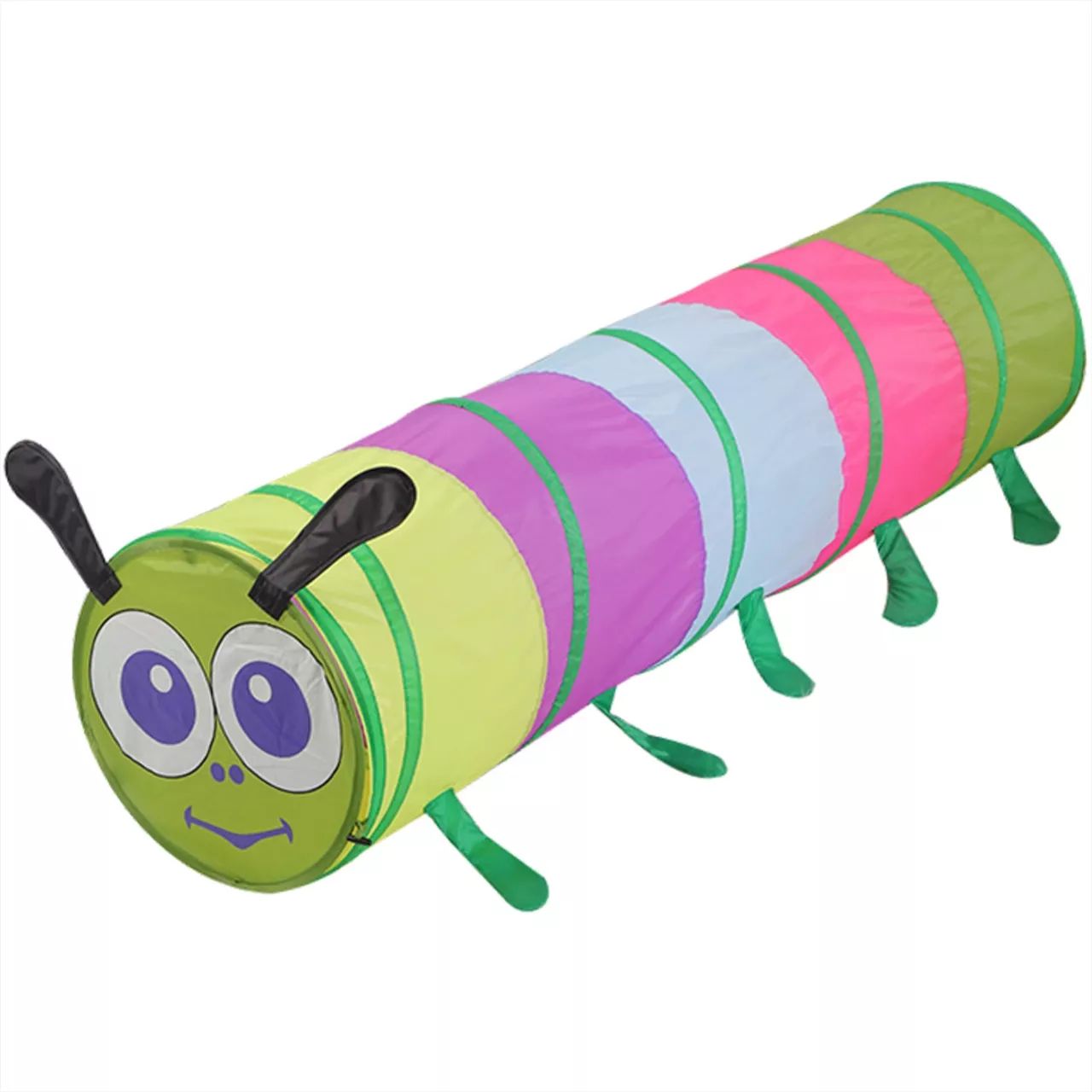 • Színes, kukac formájú gyerek alagút: játékos, vidám dizájn, barátságos arccal