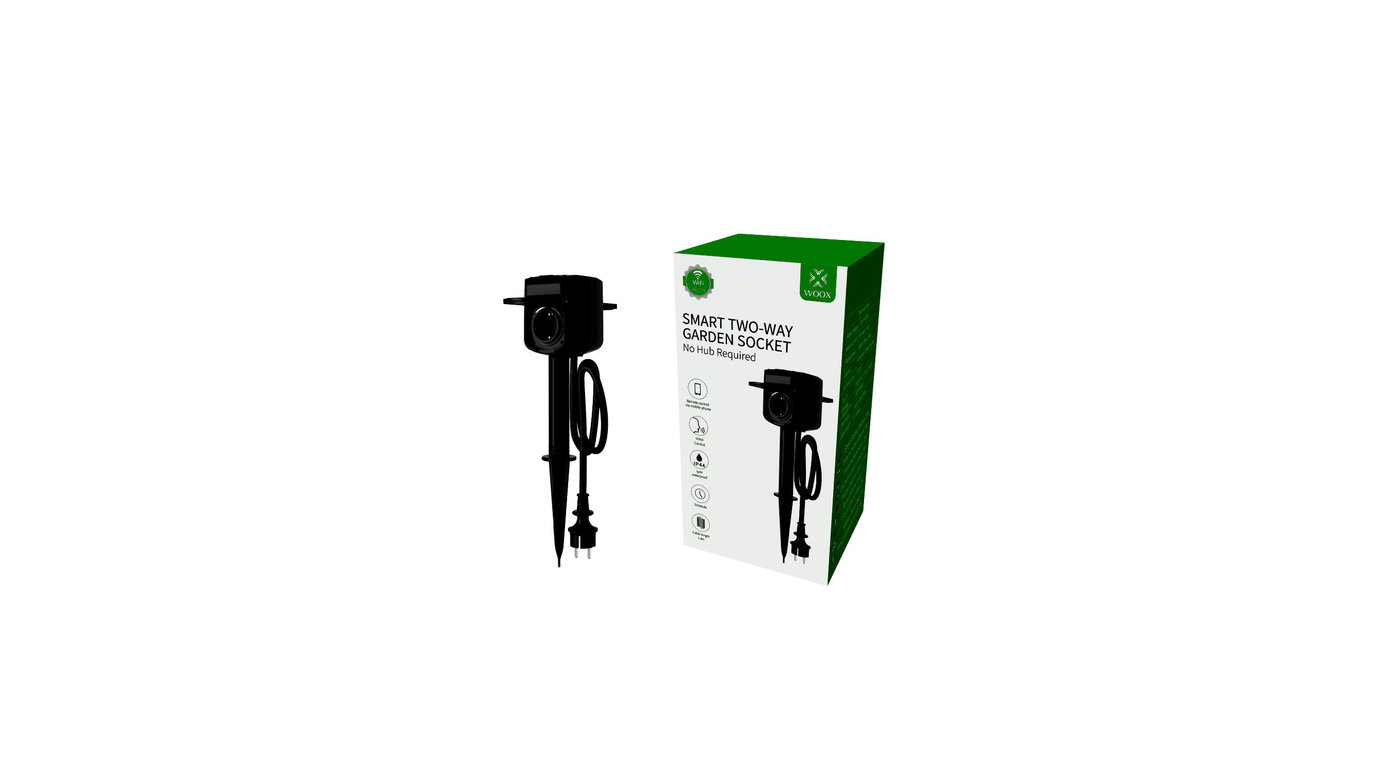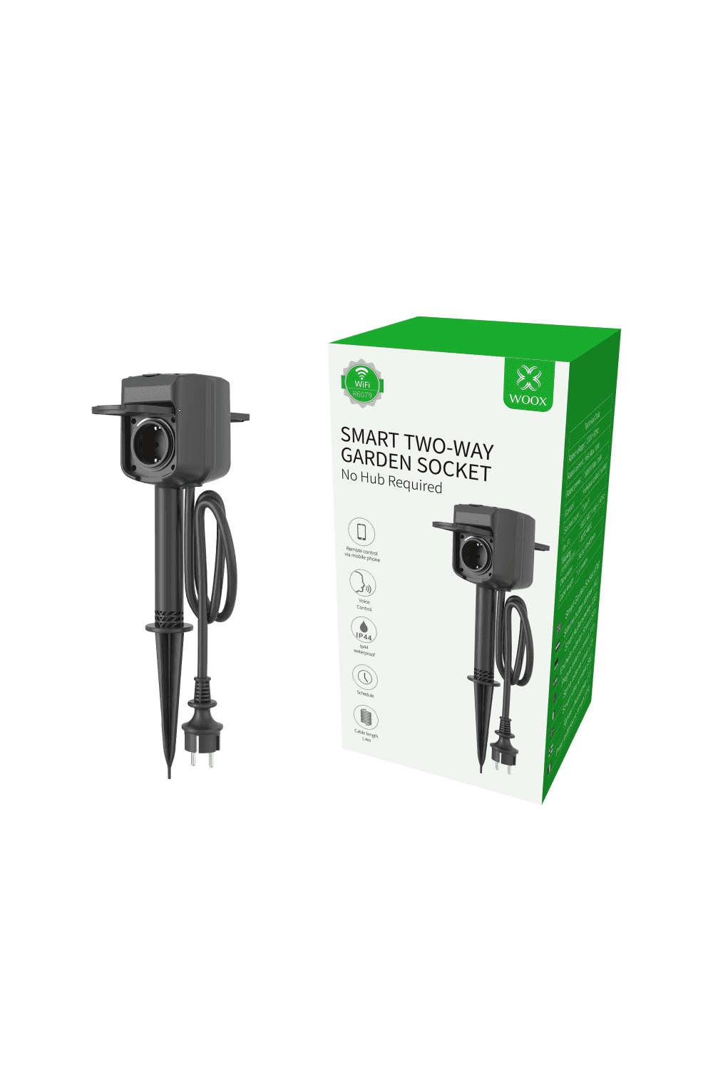 A két beépített F típusú (Schucko) aljzat külön is vezérelhető a WOOX Home alkalmazásból, így például a kerti világítás és a szökőkút külön programozható. Beállíthat időzítéseket, automatizmusokat, jeleneteket (pl. „este”, „nyaralás”), valamint távolról is ellenőrizheti, mi van éppen bekapcsolva, így energiát és időt takaríthat meg.