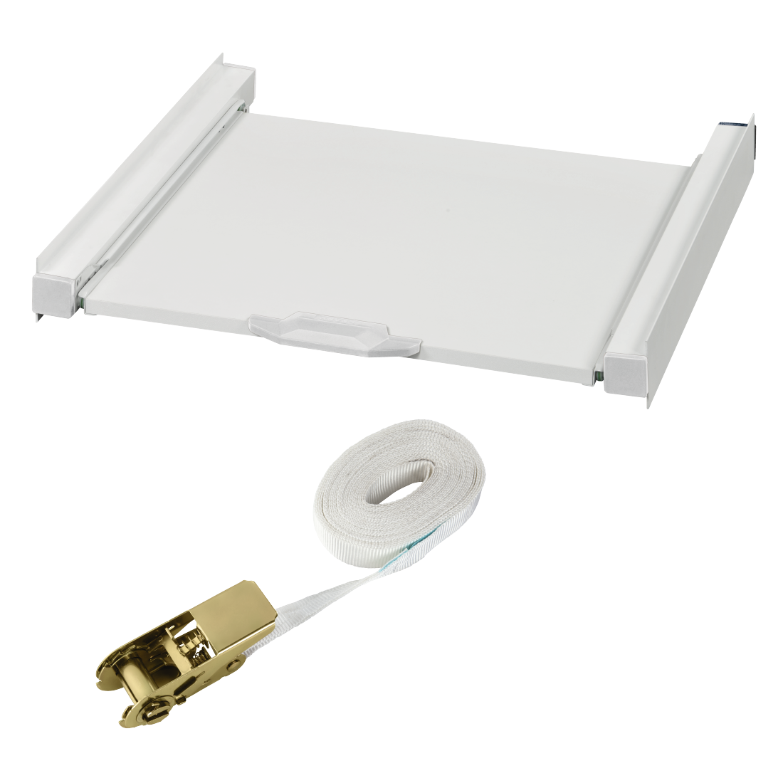 - Univerzális közbenső keret a szárító biztonságos rögzítéséhez a mosógépen: Az oldalsó sínek megakadályozzák a szárító elmozdulását, amikor a mosógép dolgozik