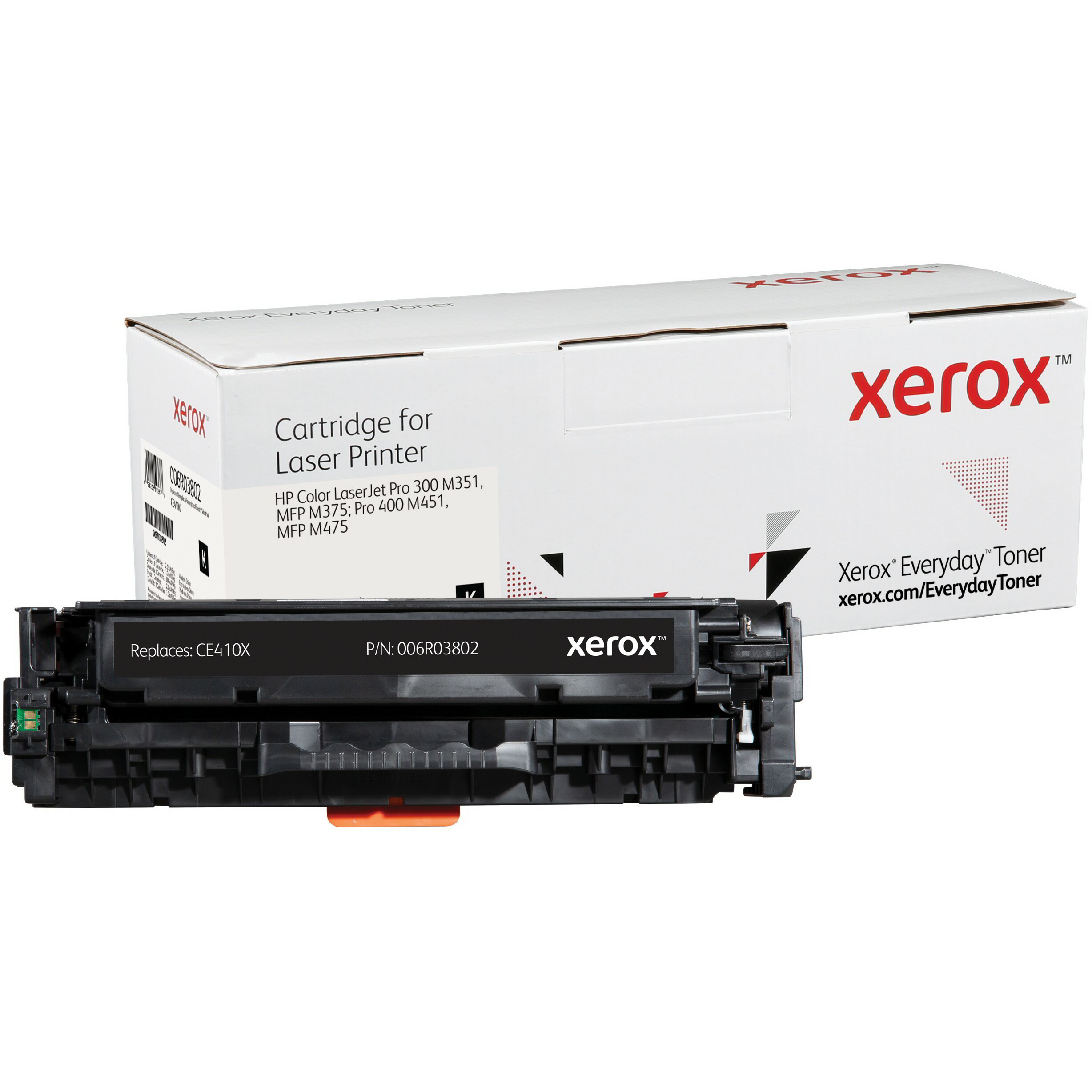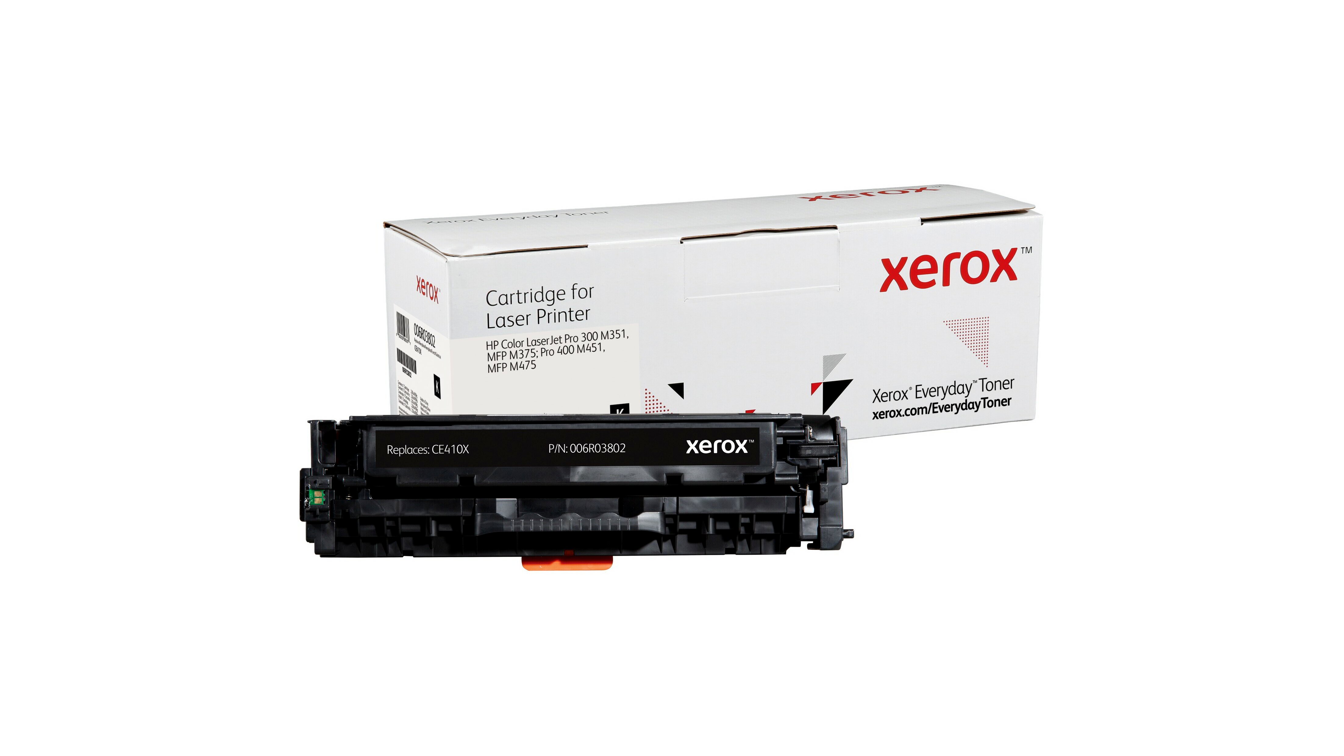 A Xerox 006R03802 fekete toner egyenértékű a HP CE410X tonerrel, 4000 oldalas kapacitással rendelkezik és a Xeroxra jellemző teljesítményt, megbízhatóságot és biztonságot nyújtja, de az eredeti gyártói patronoknál alacsonyabb áron. A Xerox Everyday toner termékkínálat a vezető gyártók nyomtatókhoz és fénymásolókhoz való tonerkazettáit tartalmazza A4 és A3 formátumú nyomtatókhoz és fénymásolókhoz. A tonerekben lévő vegyi anyagok és a kazetta műanyag összetevői megfelelnek az iparági szintű egészségügyi és környezetvédelmi előírásoknak.