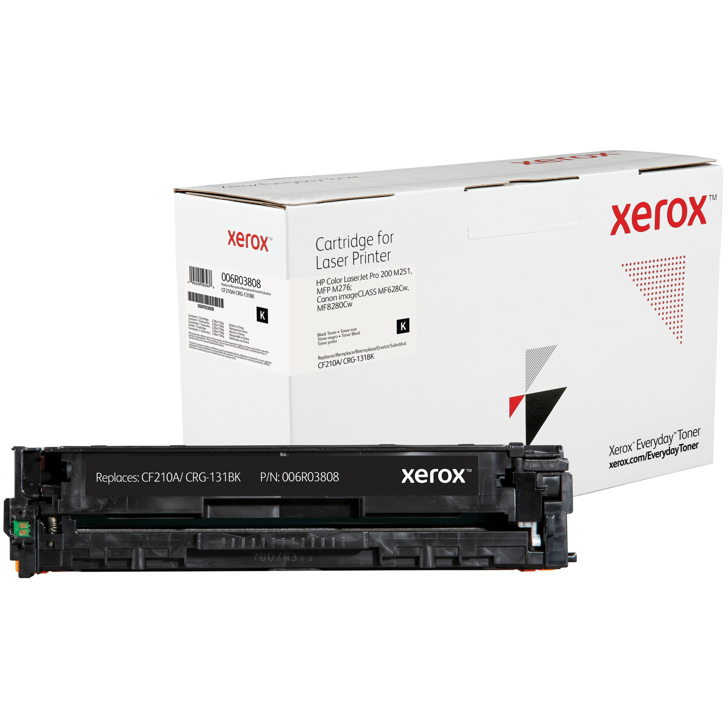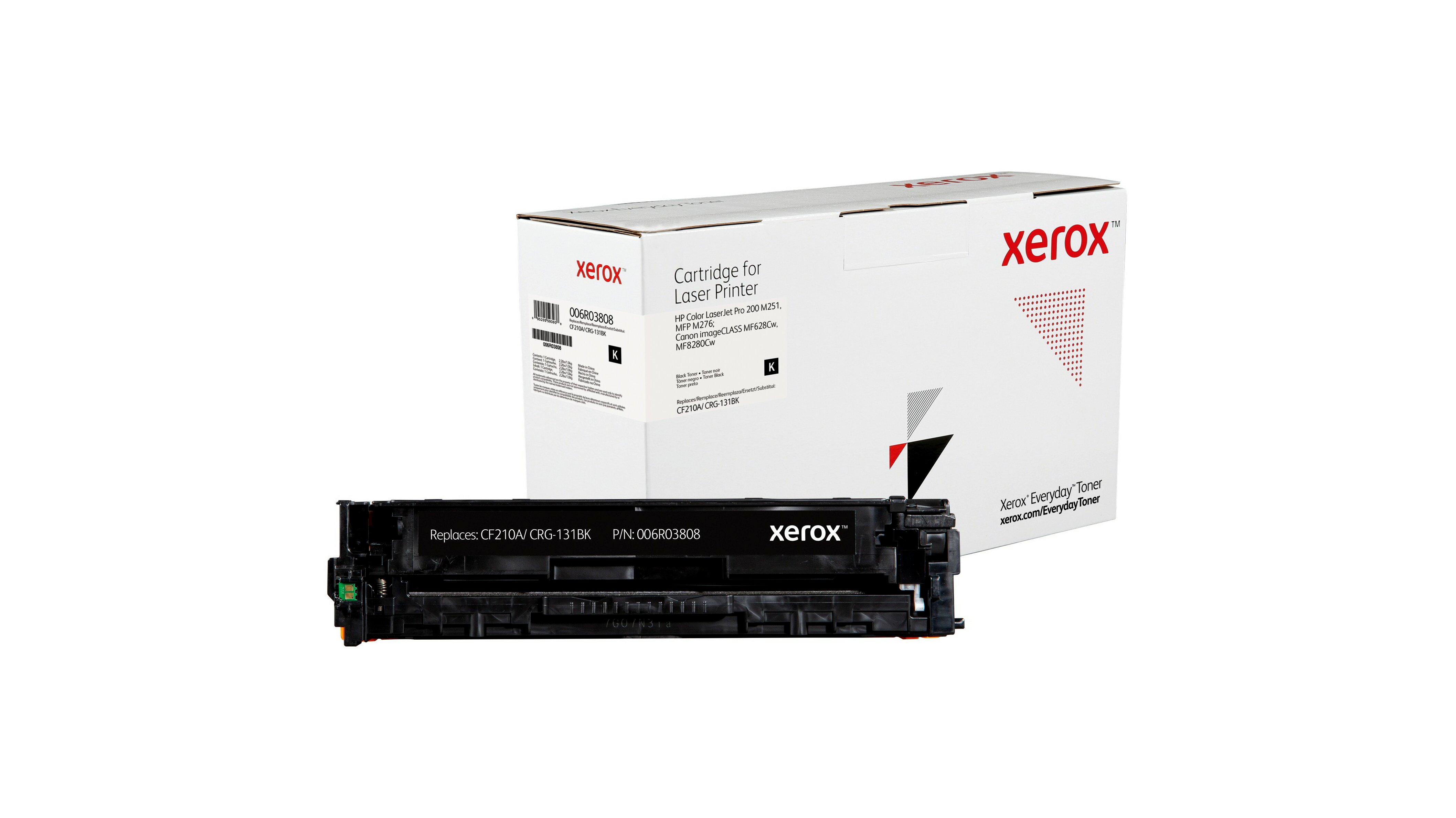 A Xerox 006R03808 fekete toner egyenértékű a HP CF210A / Canon CRG-131BK tonerekkel, 1600 oldalas kapacitással rendelkezik és a Xeroxra jellemző teljesítményt, megbízhatóságot és biztonságot nyújtja, de az eredeti gyártói patronoknál alacsonyabb áron. A Xerox Everyday toner termékkínálat a vezető gyártók nyomtatókhoz és fénymásolókhoz való tonerkazettáit tartalmazza A4 és A3 formátumú nyomtatókhoz és fénymásolókhoz. A tonerekben lévő vegyi anyagok és a kazetta műanyag összetevői megfelelnek az iparági szintű egészségügyi és környezetvédelmi előírásoknak.