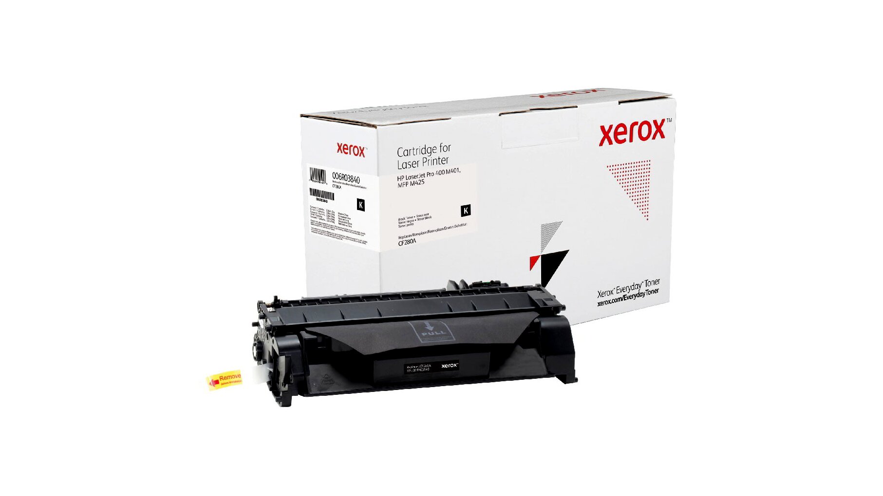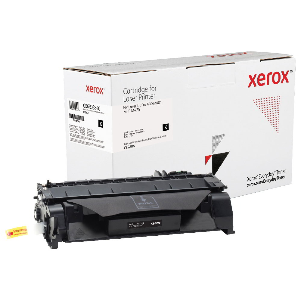 A Xerox 006R03840 fekete toner, egyenértékű a HP CF280A tonerrel, 2700 oldalas kapacitással rendelkezik és a Xeroxra jellemző teljesítményt, megbízhatóságot és biztonságot nyújta, de az eredeti gyártói patronoknál alacsonyabb áron. A Xerox Everyday toner termékkínálat a vezető gyártók nyomtatókhoz és fénymásolókhoz való tonerkazettáit tartalmazza A4 és A3 formátumú nyomtatókhoz és fénymásolókhoz. A tonerekben lévő vegyi anyagok és a kazetta műanyag összetevői megfelelnek az iparági szintű egészségügyi és környezetvédelmi előírásoknak.