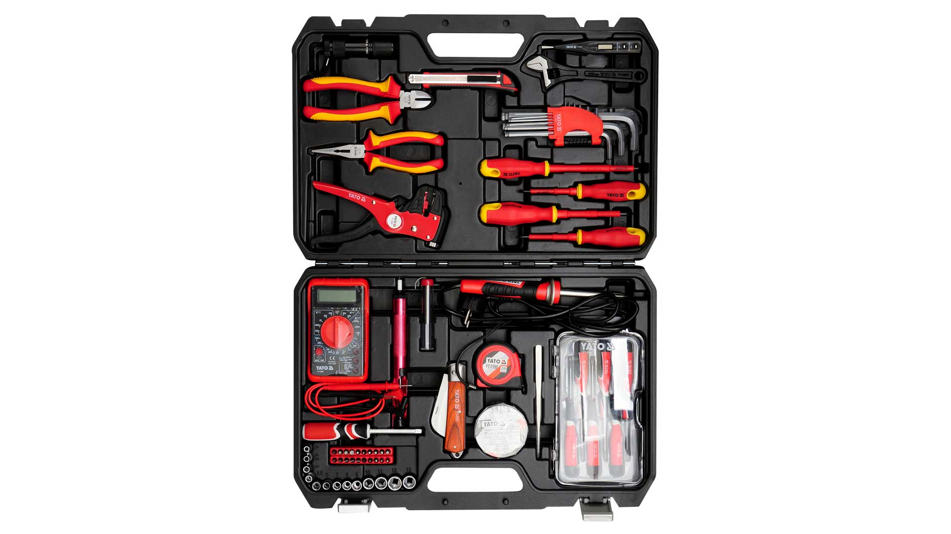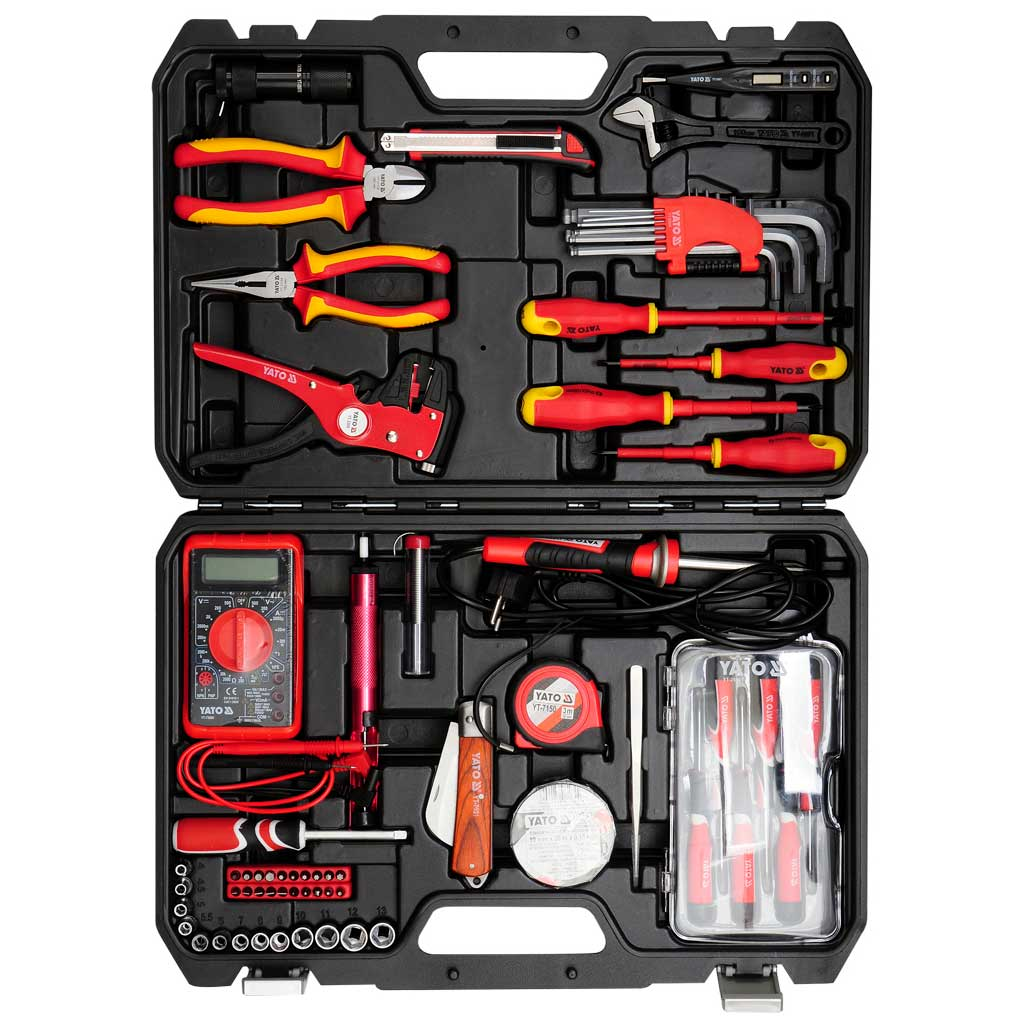 Professzionális szerszámkészlet villanyszerelőknek. 68 speciálisan kiválasztott szerszámot tartalmaz. A fogó és a csavarhúzó VDE szigetelt fogantyúval rendelkezik, 1000 V feszültségig.
