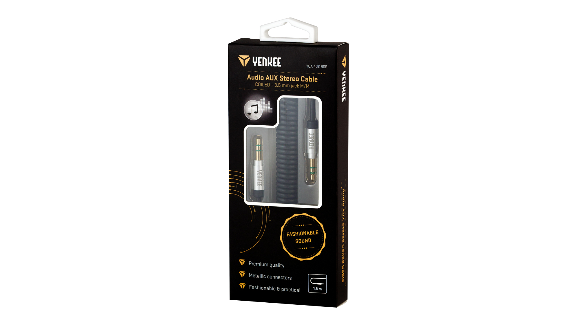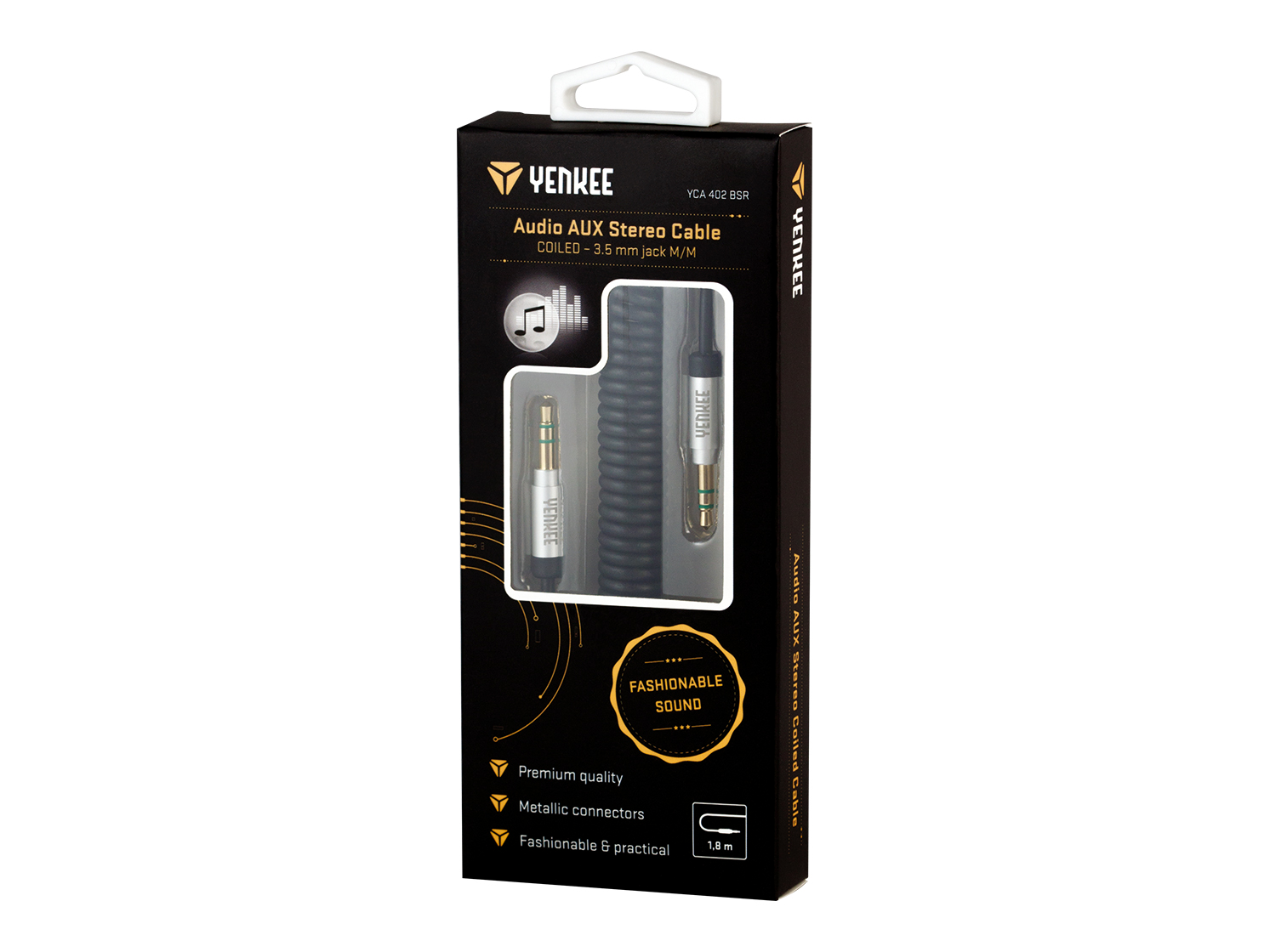 Sztereó audió AUX spirálkábel 3,5mm-es jack csatlakozóval és színes fémcsatlakozóval.
