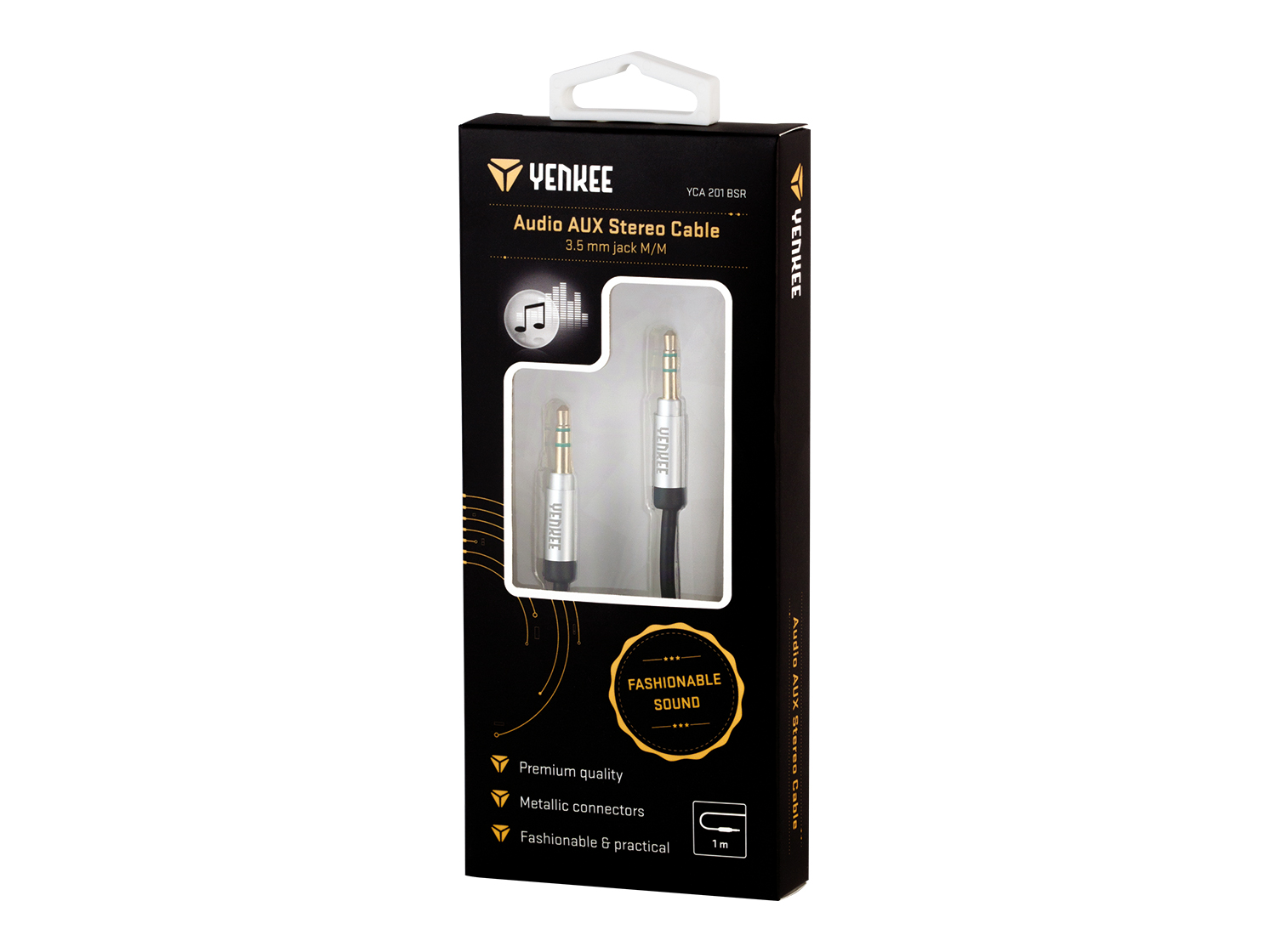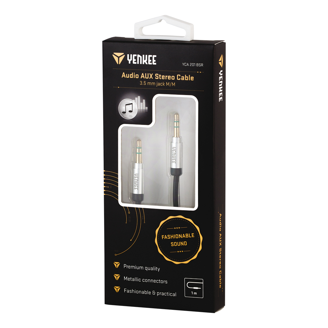 Sztereó audió AUX kábel 3,5mm-es jack csatlakozóval és színes fémcsatlakozóval.