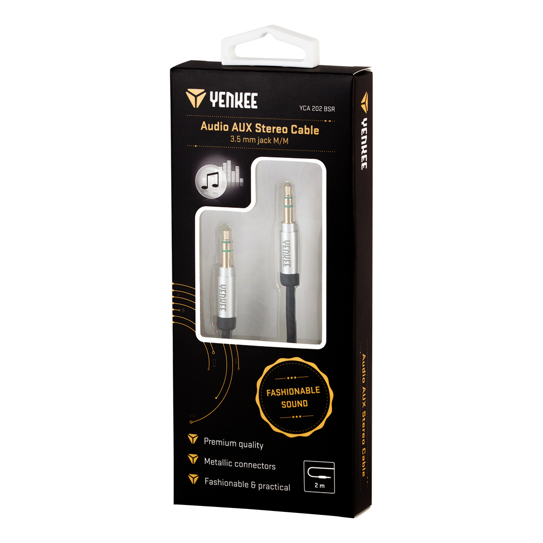 Sztereó audió AUX kábel 3,5mm-es jack csatlakozóval és színes fémcsatlakozóval.