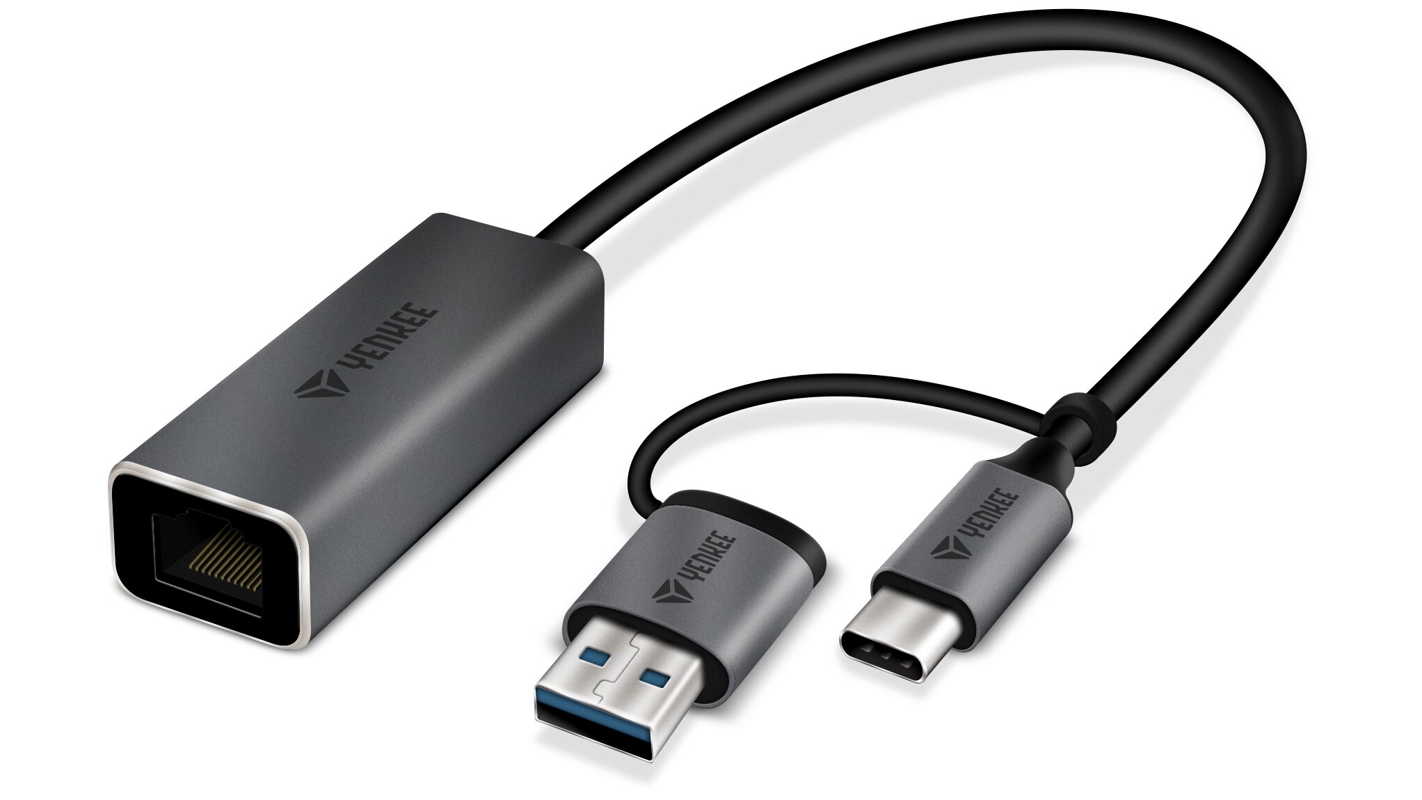 Akár USB-A, akár USB-C segítségével kell csatlakoznod az internethez, rá mindig számíthatsz. Mert mindkét típusú USB-vel rendelkezik. Rajtad áll, hogy melyik portot választod. A másik végén természetesen egy klasszikus RJ-45-ös csatlakozó található a hálózati kábel csatlakoztatásához.