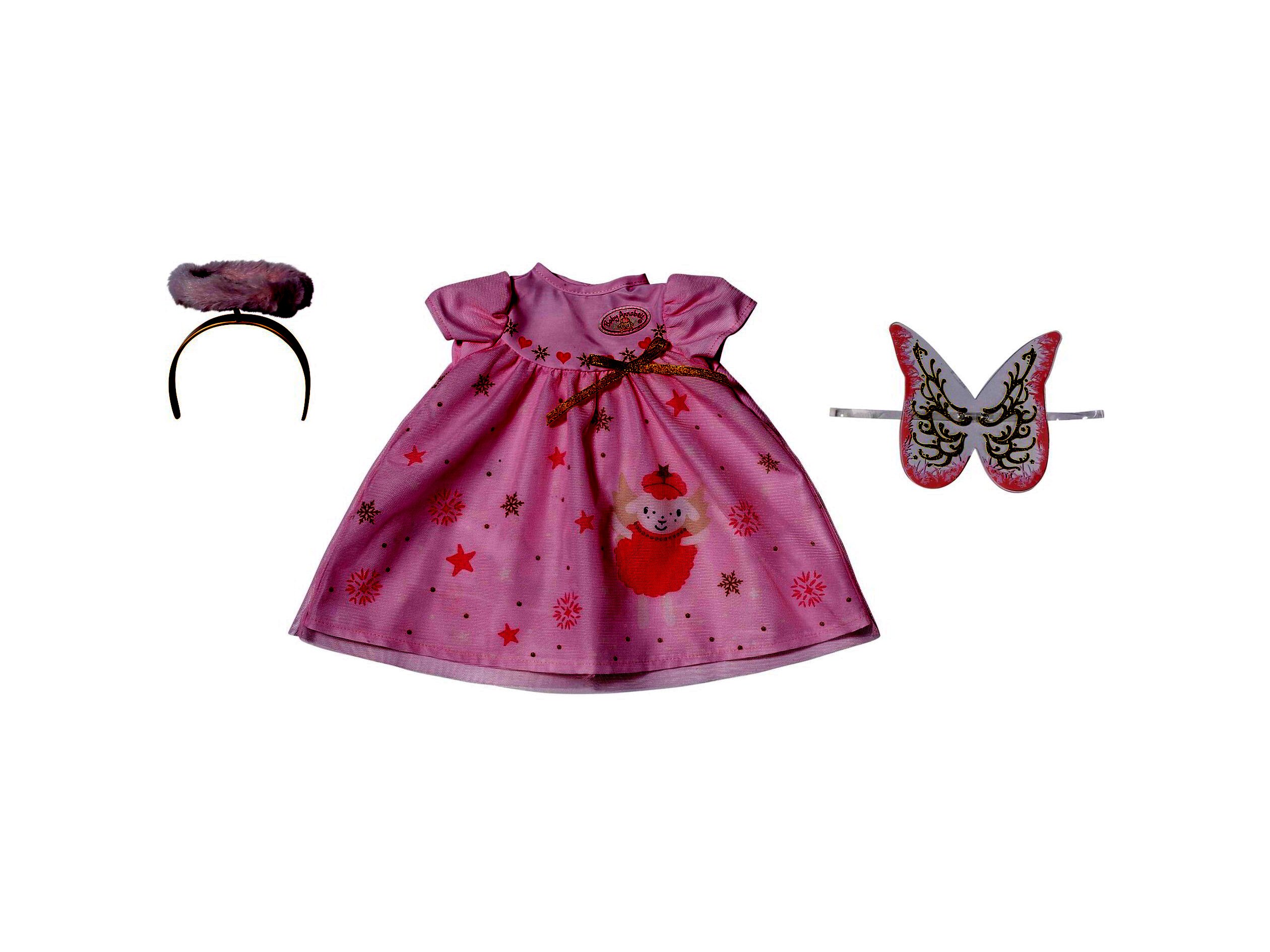 A szoknyarészen Baby Annabell® kedvenc báránya szerepel, karácsonyi témájú grafikában. A mellrészen egy aranyos kis masni található, amely még inkább kiemeli az öltözet kedvességét. A ruha mellé tartozik még egy pár szárny és egy aranyszínű hajas fejpánt világosrózsaszín plüss szegéllyel, amely tökéletesen illik a kis angyal jelmezhez.