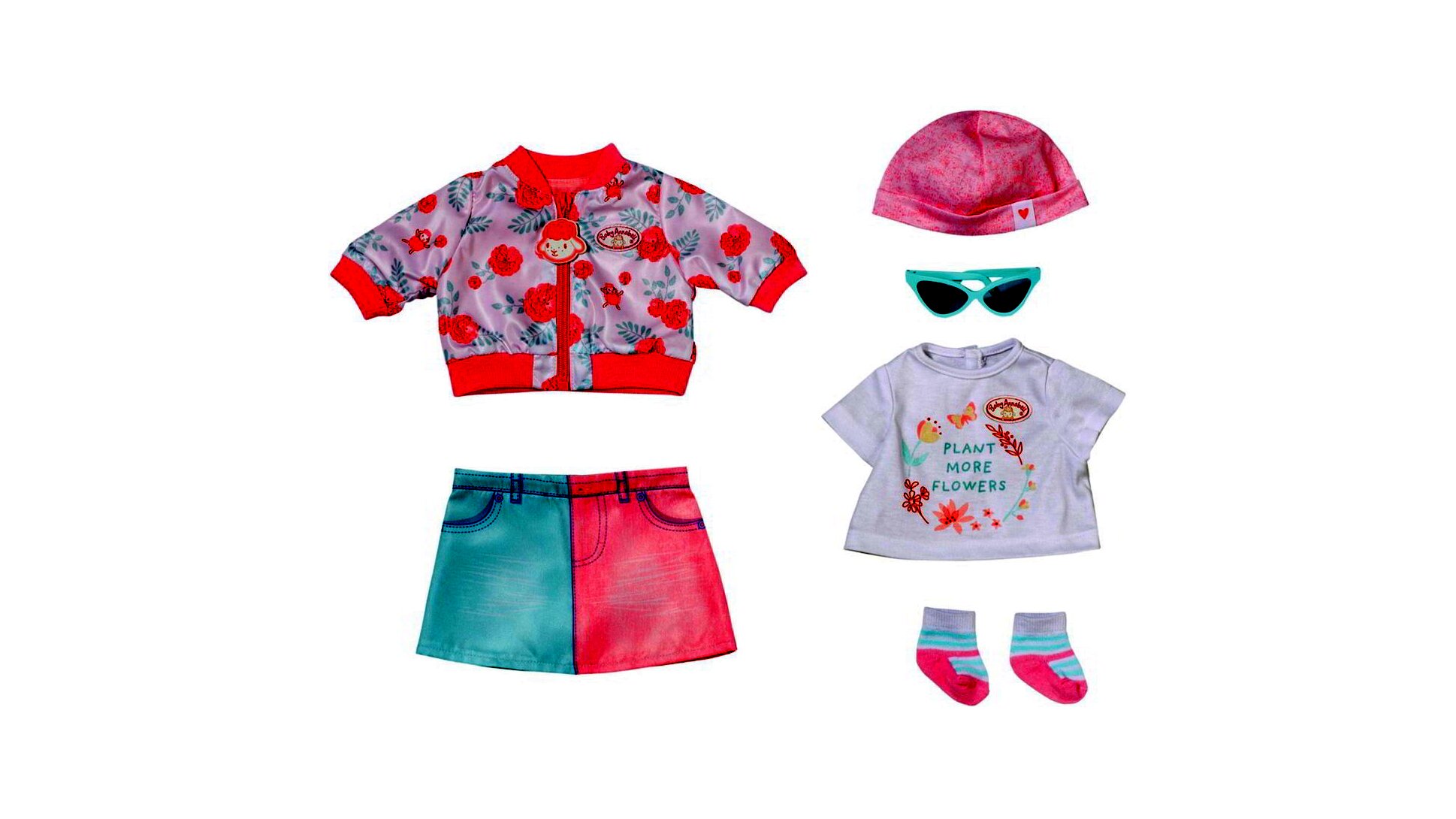 A szett központi elemei a két színű, farmerhatású szoknya és a bájos virágmintás póló és dzseki. A szoknya egyedi, kétszínű kialakításával igazán egyedi megjelenést kölcsönöz Baby Annabell® babának. A különféle virágminták frissességet és játékosságot csempésznek a szettbe, míg a csinos kis póló és dzseki tökéletes harmóniát teremtenek.