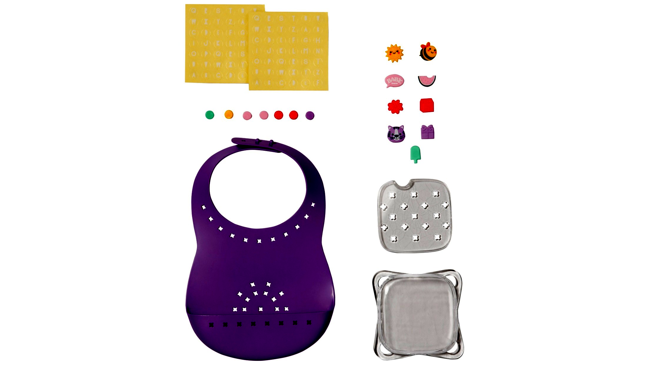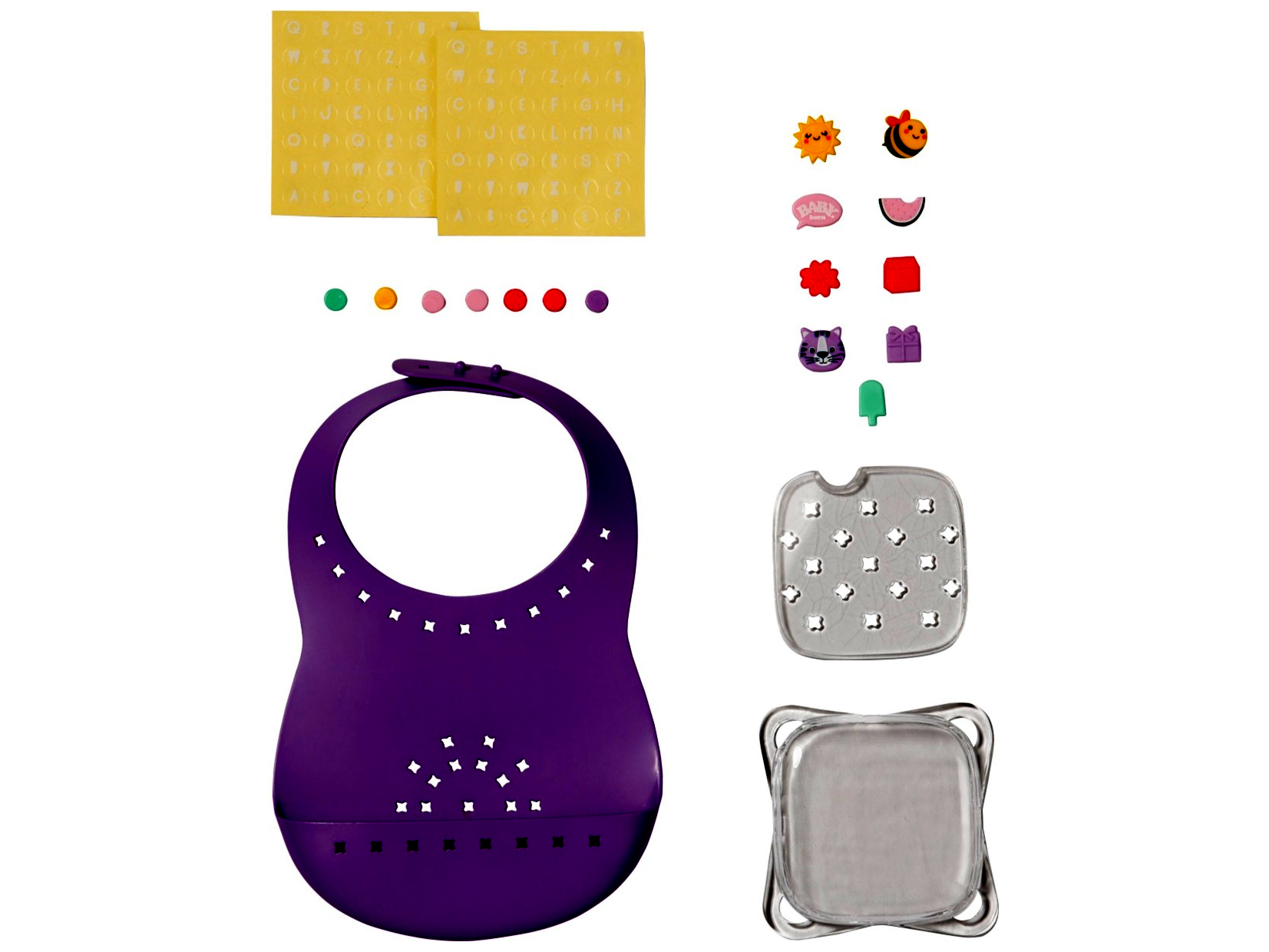Ez a különleges, díszíthető baba előke tökéletes kiegészítő minden kis gondoskodó „anyuka” és „apuka” számára. A műanyagból készült, lila színű előkét a mellékelt díszítő pinnel (gombokkal) lehet egyedivé varázsolni, így a gyerekek nemcsak etetés közben használhatják, hanem alkotó, kreatív játék során is.