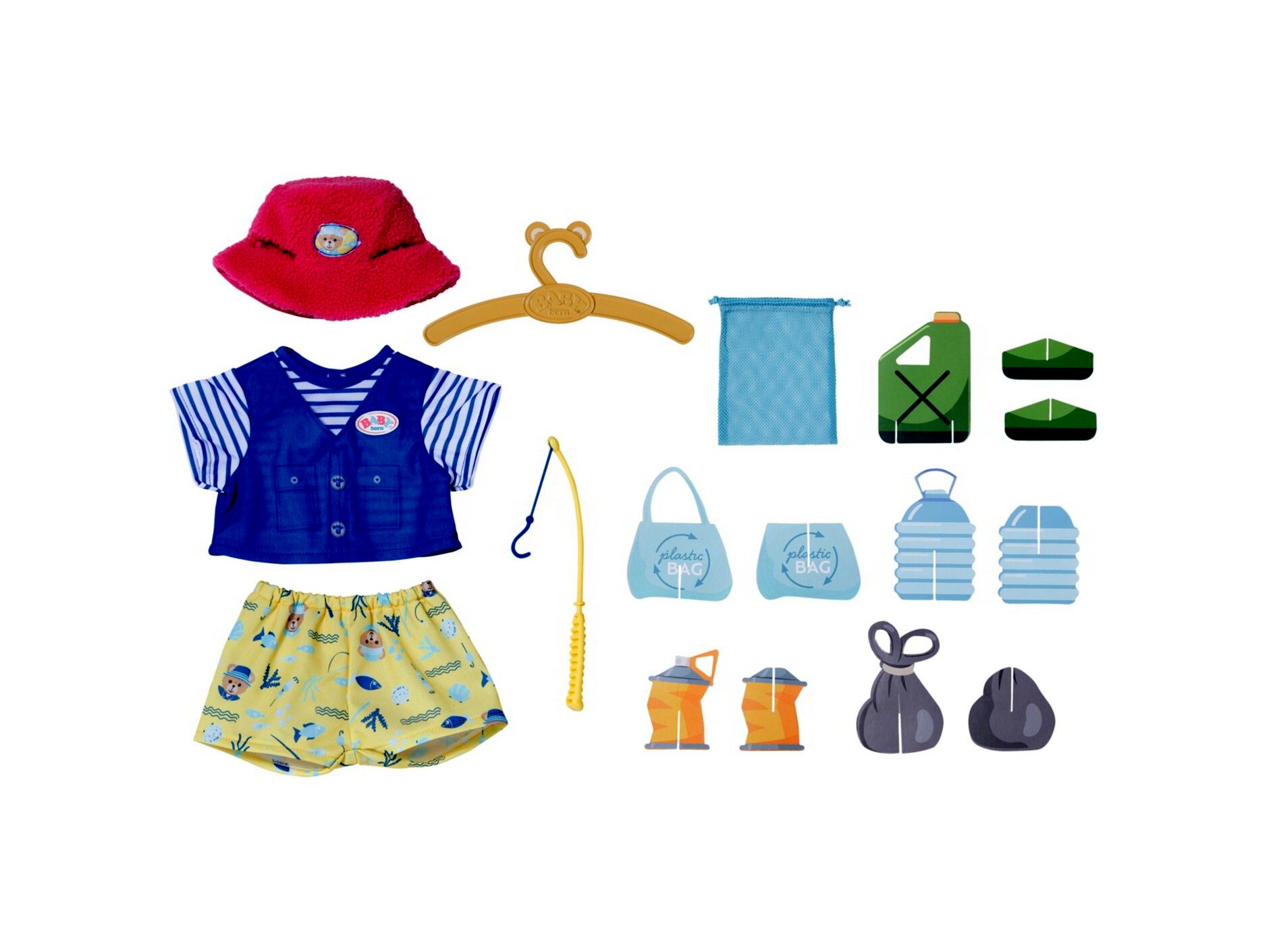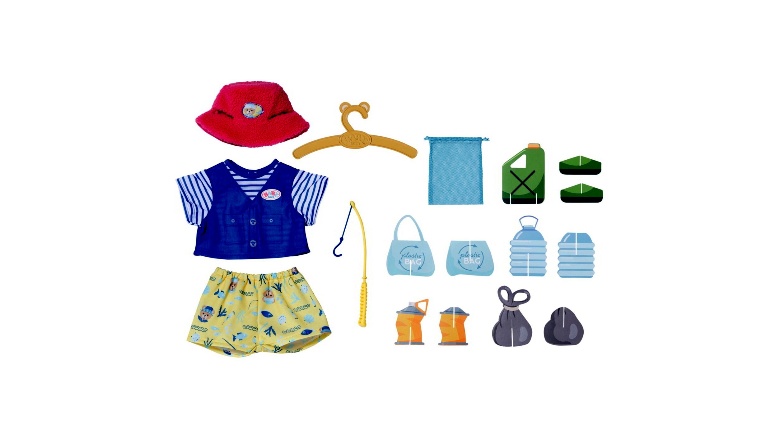 - Szett tartalma: Puha plüss sapka, mellény, rövidnadrág, horgászbot és kartonból készült "műanyag hulladék".