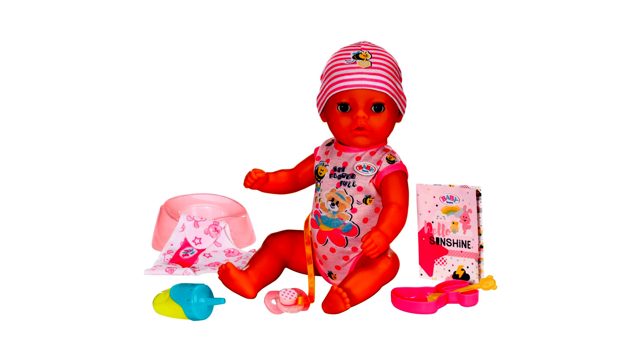 Ez a csodás baba képes cumisüvegből inni, anyagtisztítós pelenkát használni és még a rózsaszín bilire is ráülni. A bájos szemei különlegesen nyílnak és záródnak, akár ül vagy fekszik, a mágikus cumijának köszönhetően. Az ágyba fektetve pedig magától lehunyja a szemét, a valóság hű utánzására. Mozgatható karjai, lábai és feje a babát könnyen öltöztethetővé és vetkőztethetővé teszik.