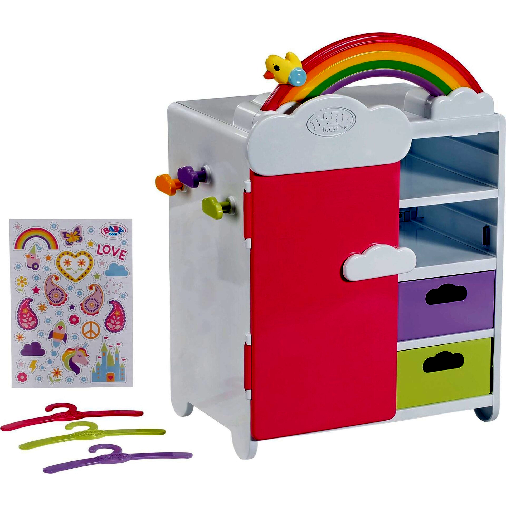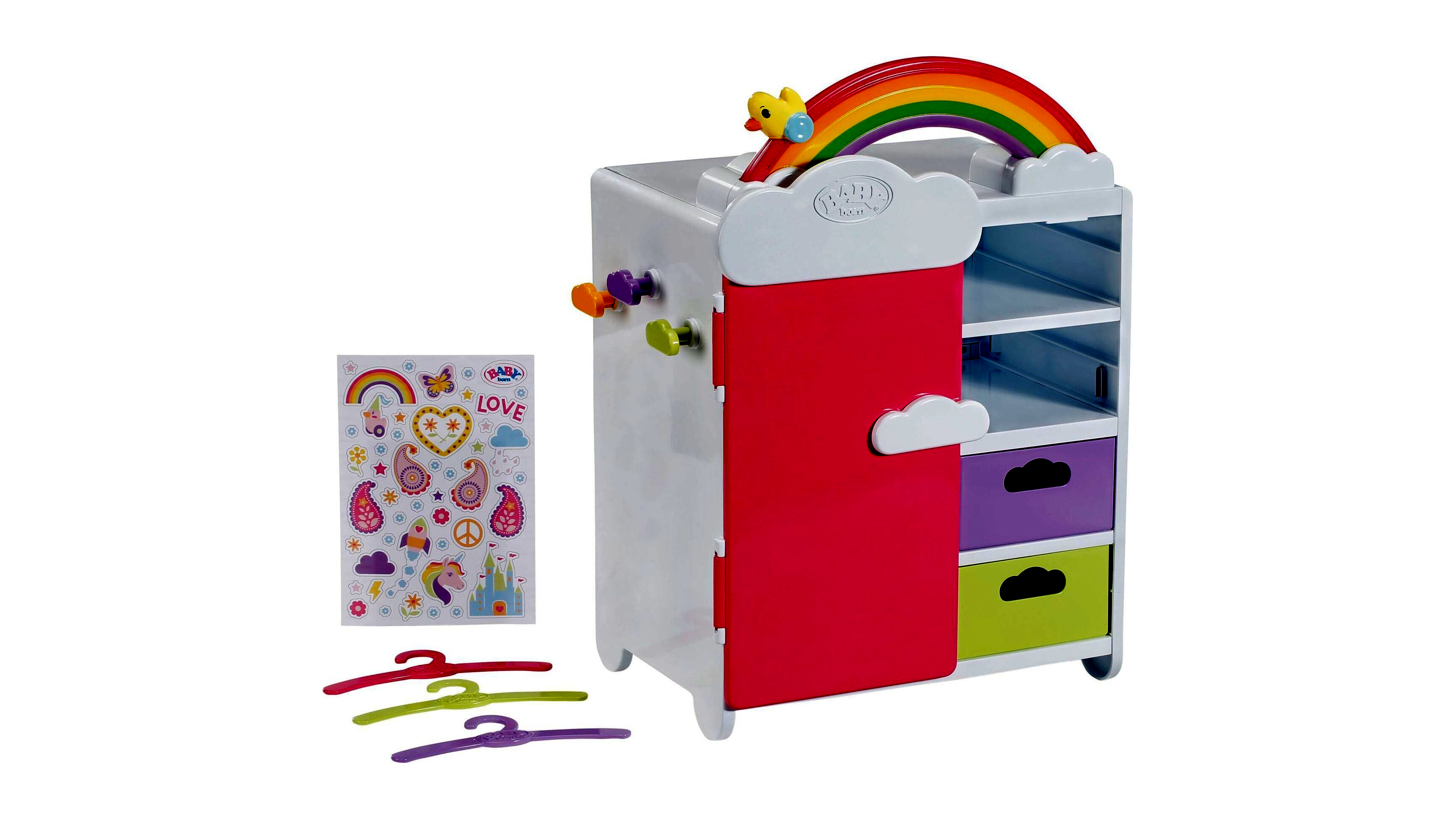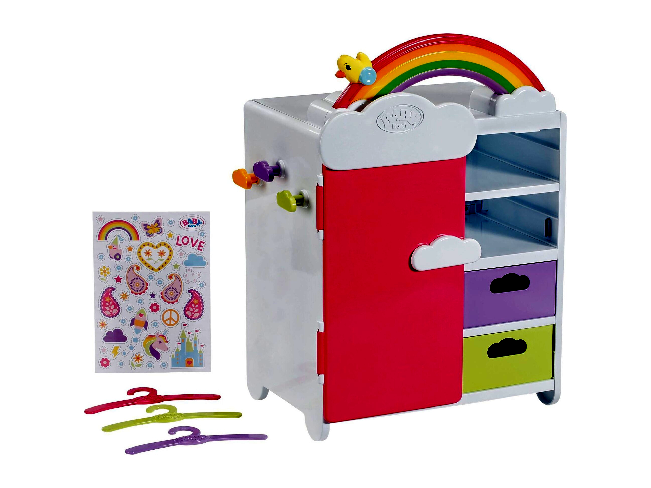 Ez a csodálatos szekrény tökéletes kiegészítője minden BABY born babaszobának! A Regenbogen Szekrény elegendő helyet biztosít minden szükséges babaruhának és kiegészítőnek. Rendelkezik ruhafogassal, polcokkal és kivehető fiókokkal. A szekrény külső oldalain aranyos felhő akasztók találhatóak, amelyeken táskák vagy egyéb dolgok tárolhatók. A szekrény a mellékelt matricákkal egyedileg díszíthető, így igazán egyedi megjelenést kölcsönözhet neki a gyermek.