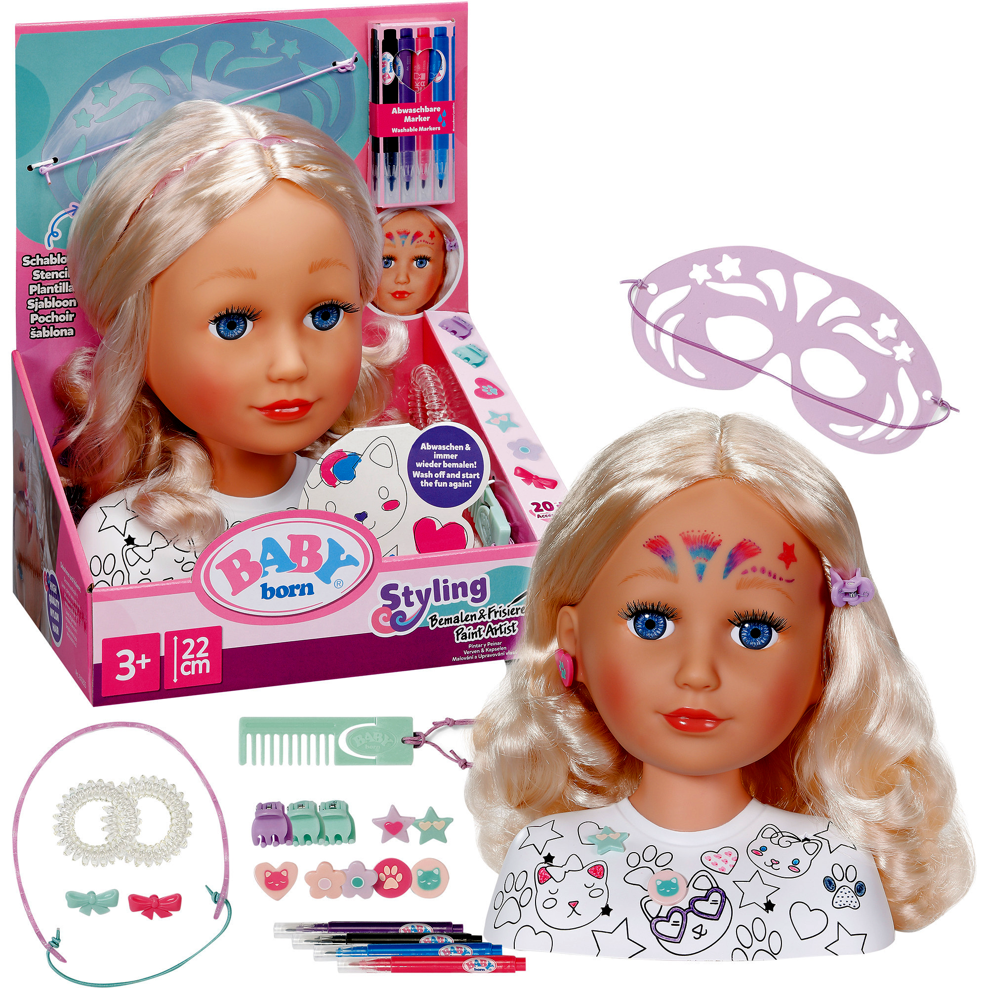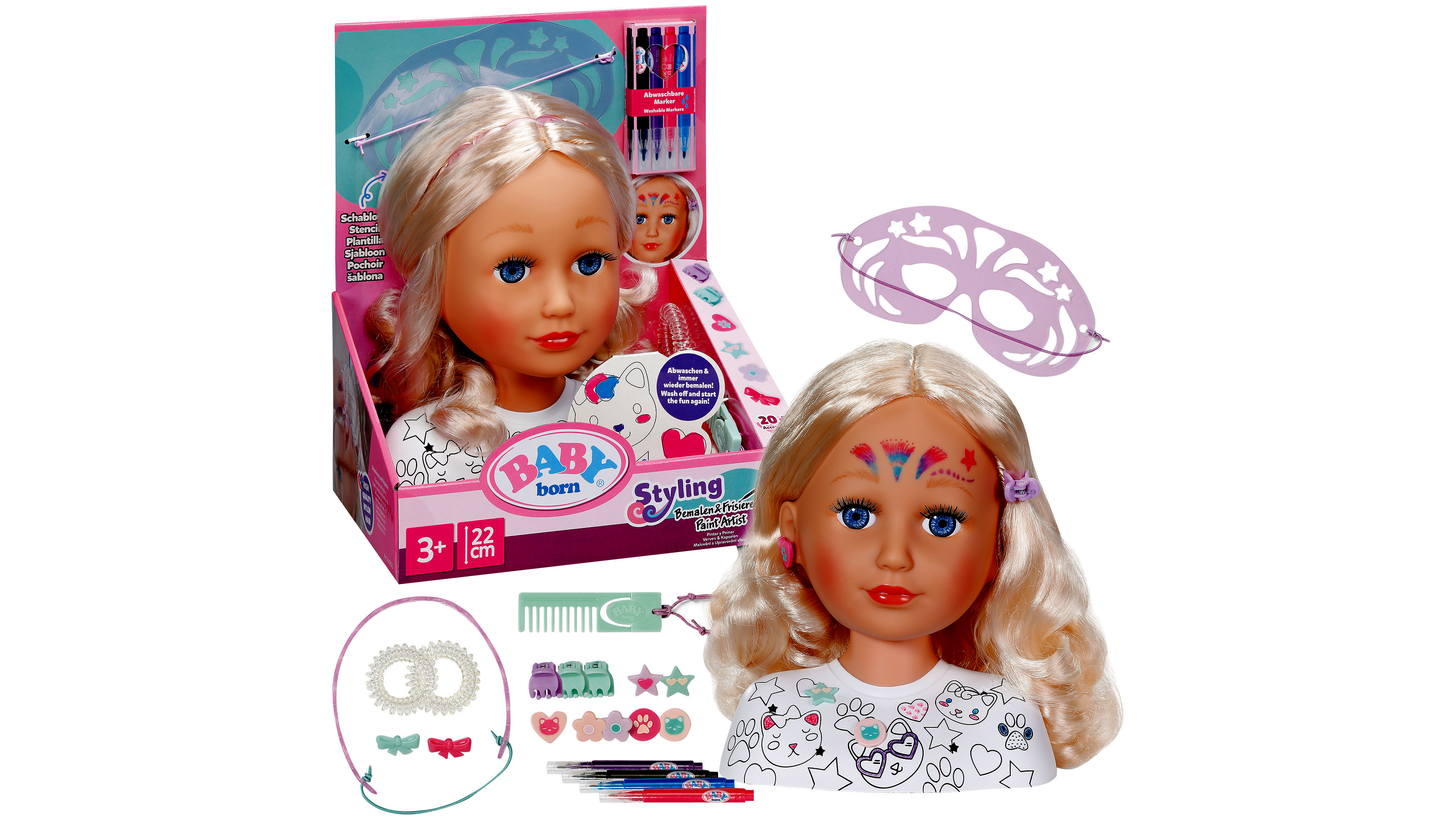 A BABY born hajformázó és sminkelő fej igazi mini szépségszalon, amelyben a gyerekek szabadon kipróbálhatják a frizurakészítés és a sminkelés örömét. A hosszú, fényes haj újra és újra formázható, így a kicsik bátran kísérletezhetnek fonással, copfokkal, hullámokkal és különleges hajdíszítésekkel. A nagy méretű sminkelhető felületnek és a mellékelt sminkceruzáknak köszönhetően a fantáziadús arcfestés is a játék része lesz.
