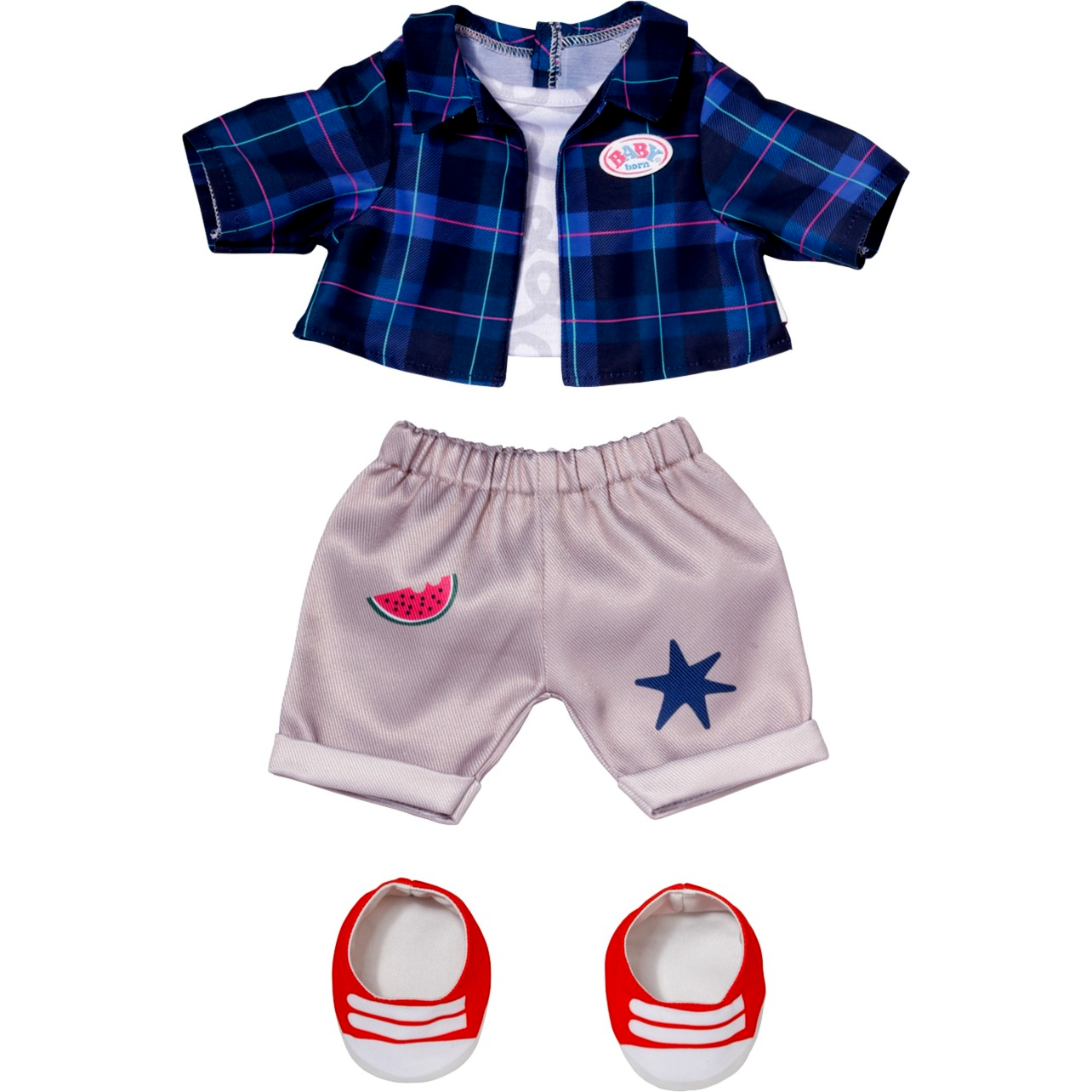 Tapasztald meg a divat és játék tökéletes kombinációját a BABY born® Teddy Cool-Outfit szettel! Ezzel a vidám ruha szettel, amely egy kockás kabátból, csillogó nadrágból és piros cipőkből áll, kedvenc babád mindig stílusos lehet. A nadrágot egy csillag és egy dinnye nyomattal díszítették, ami még különlegesebb megjelenést kölcsönöz a szettnek.
