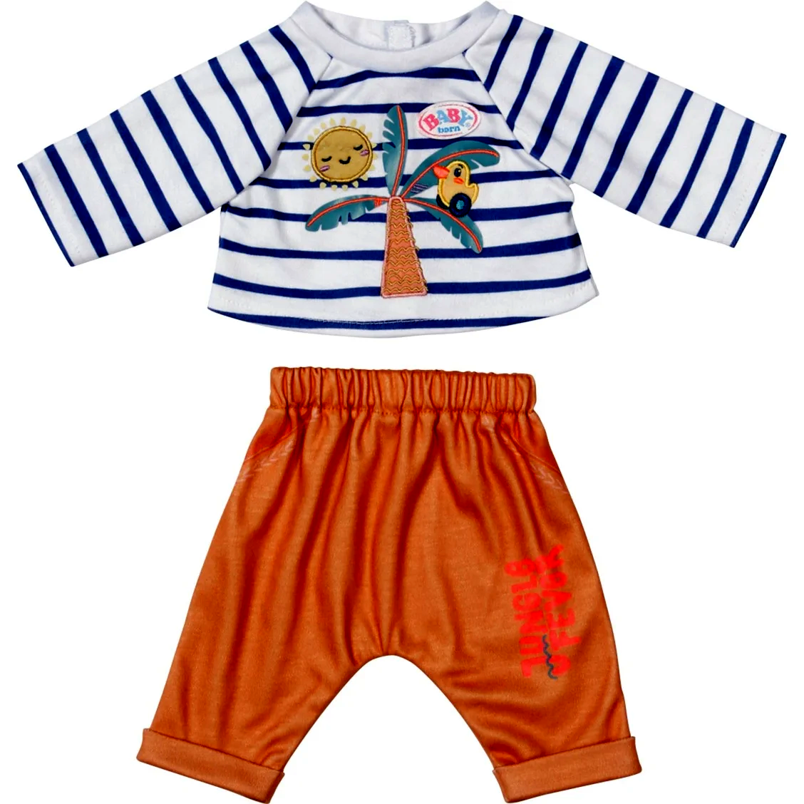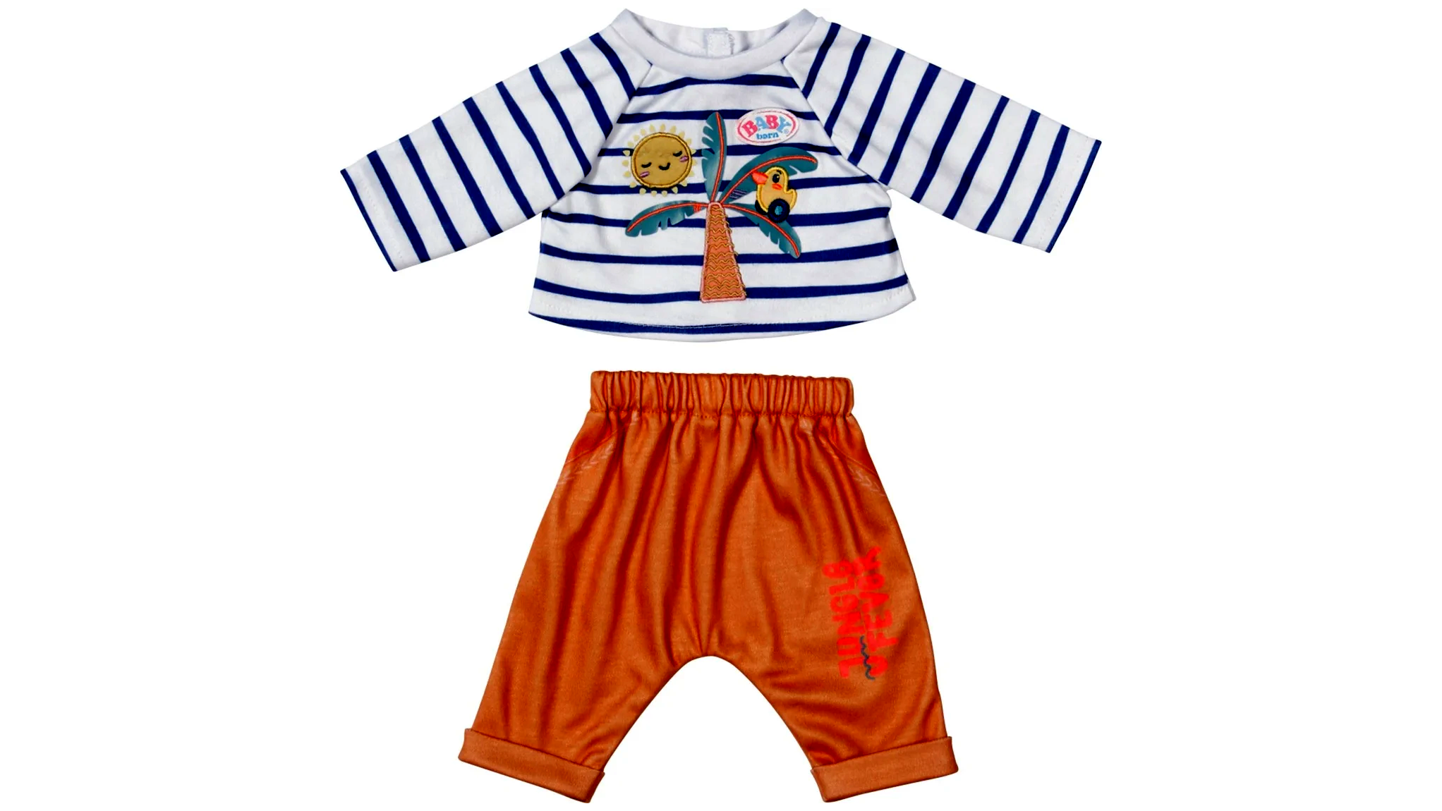 Élvezd a nyár minden pillanatát ezzel a stílusos baba ruhaszettel, amely kifejezetten a 43 cm-es BABY born® babák számára készült! Ez az igazán trendi szett kombinál egy kék-fehér csíkos felsőt, egy fényes barna nadrágot, és egy palmafás, napocskás mintával díszített applikációt. Ente Berte is helyet kapott az egyik pálmalevélen, így egészen biztosan kedvenceddé válik ez a lüktető nyári hangulatot hozó ruha.