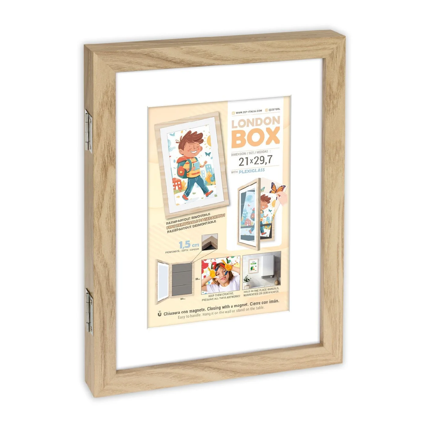 A természetes fa hatású, doboz jellegű kialakítású natúr fa tároló képkeret ideális választás mindazoknak, akik szeretnék értékes dokumentumaikat, bizonyítványaikat, kézirataikat vagy rajzaikat ízlésesen, mégis biztonságosan tárolni és kiállítani. Letisztult formavilága miatt tökéletesen illeszkedik modern, skandináv vagy klasszikus enteriőrökbe, legyen szó irodáról, dolgozószobáról vagy nappaliról.