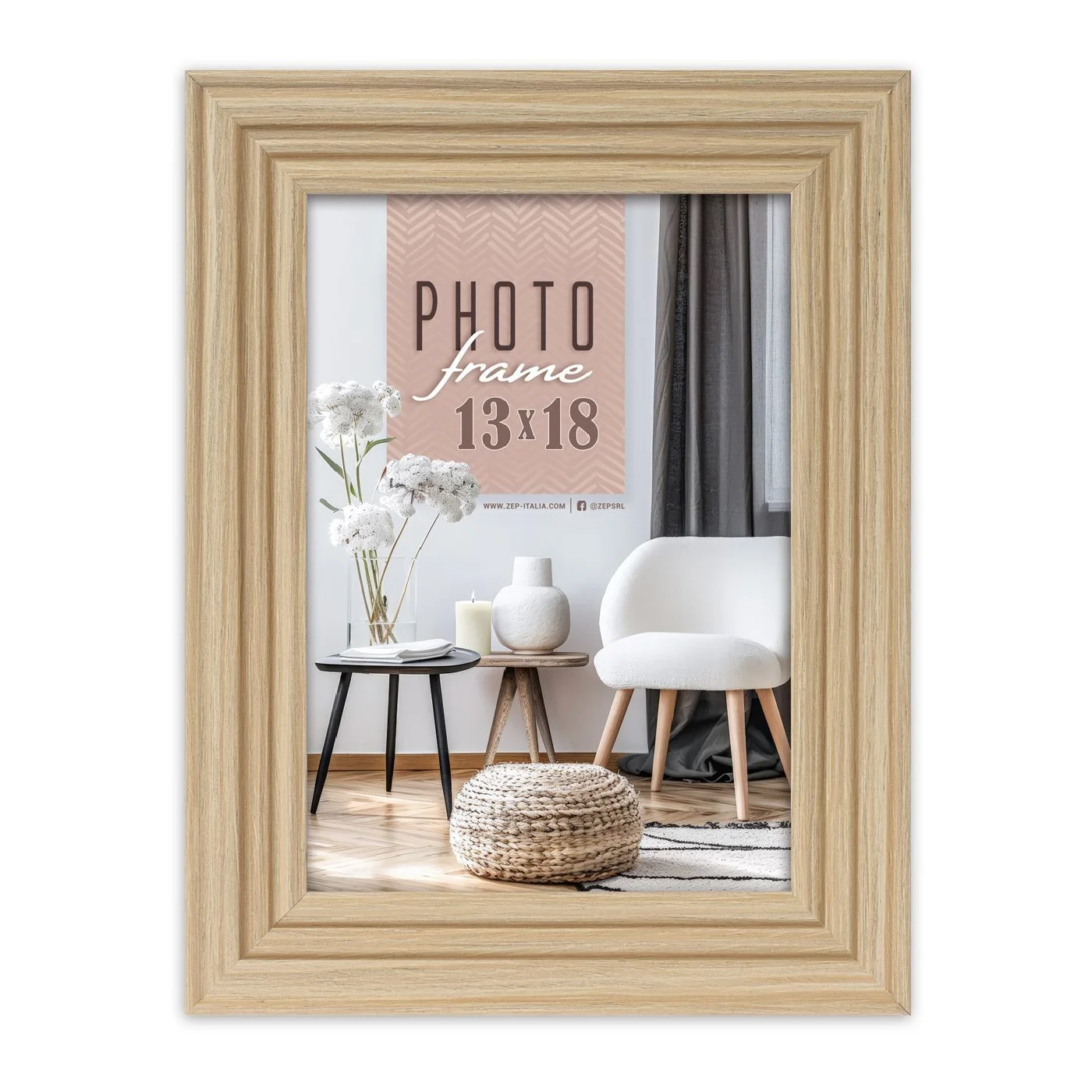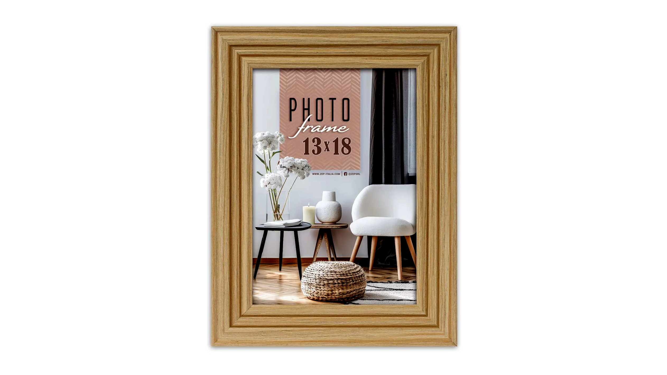 A klasszikus vonalvezetésű, natúr fa képkeret letisztult formavilágával bármilyen enteriőrben megállja a helyét. A letört (fózolt) élű profil, a 30 mm széles keretléc és a természetes faerezet harmonikus összhangja kiemeli a belehelyezett fotók, nyomatok vagy grafikák hangulatát, miközben diszkréten a háttérben marad.