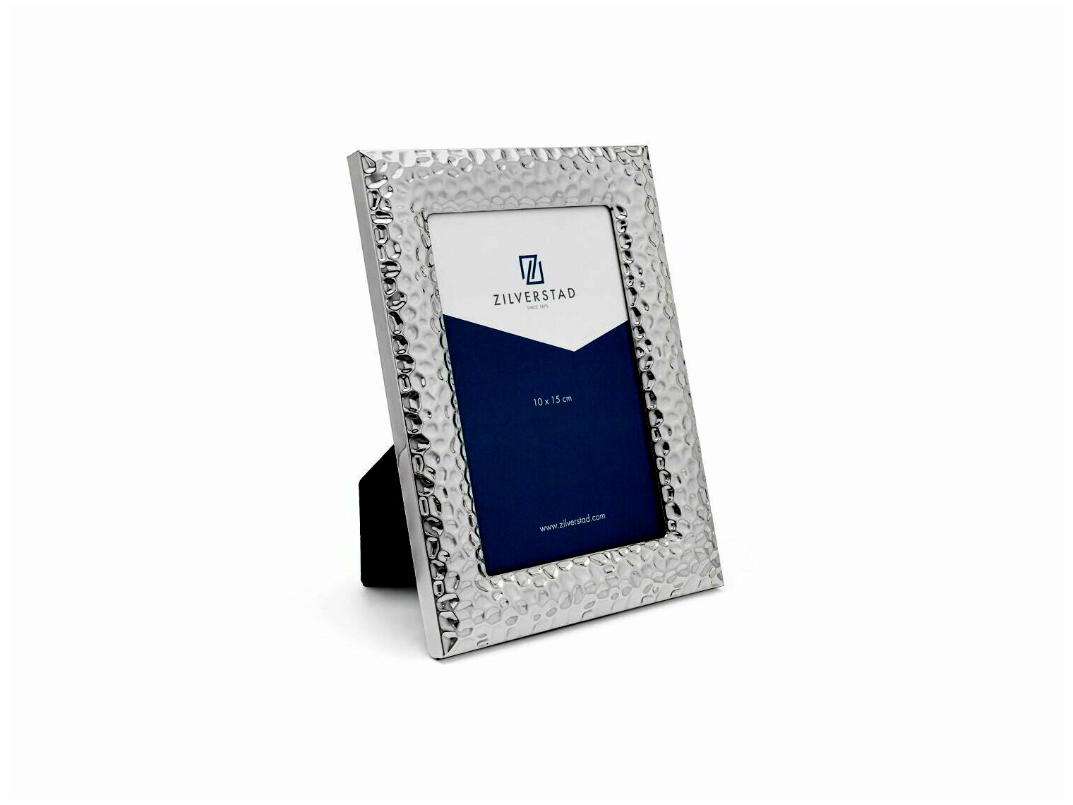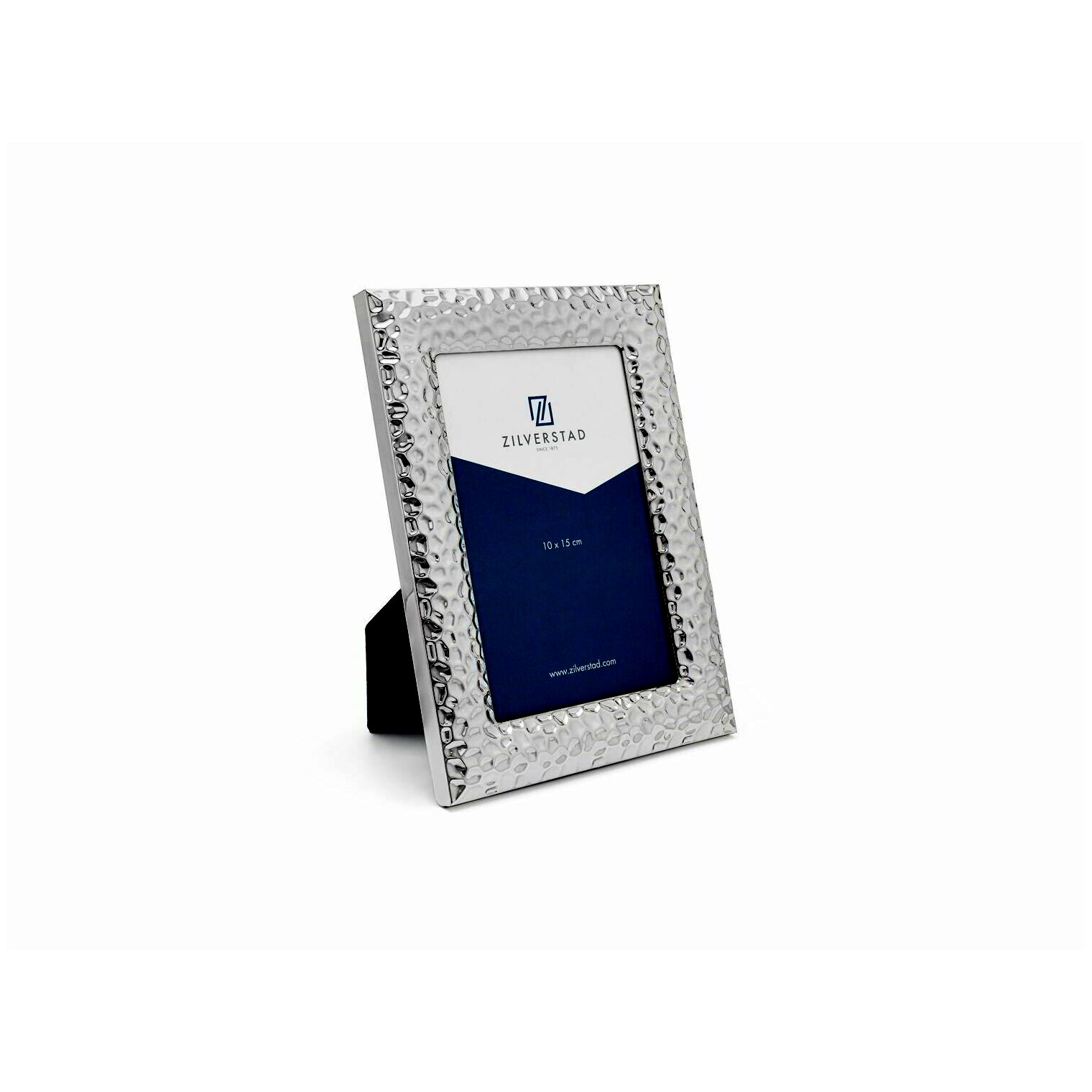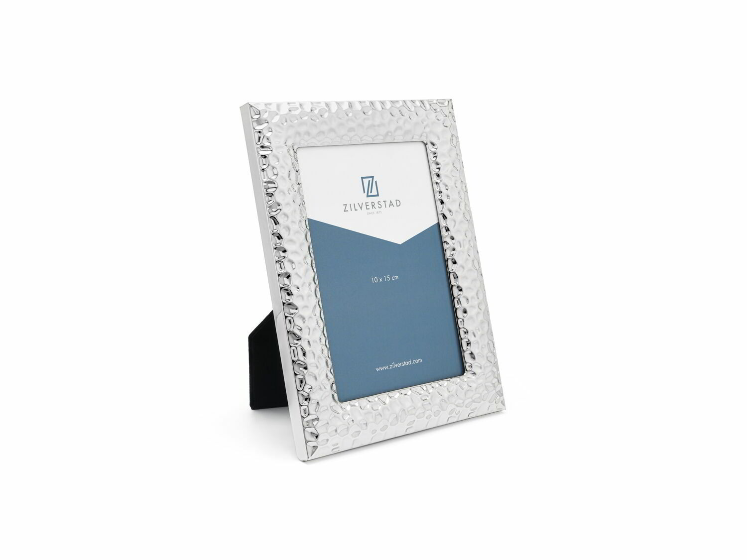 Ezüstözött lakkozott fotókeret széles szegéllyel. Állva és akasztva is használható. A háta velúrral van ellátva.