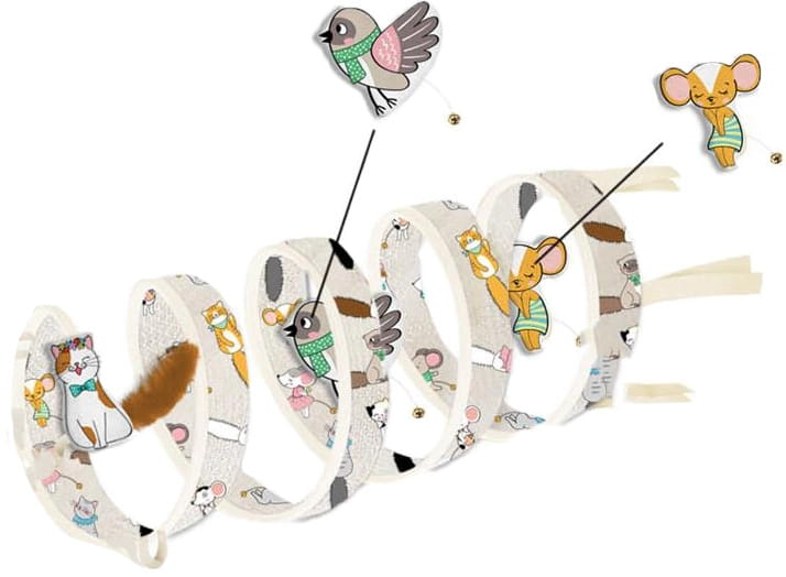 A zárt, de mégis átlátható alagút egyszerre búvóhely és játszótér. A spirális forma különösen izgalmas mozgásteret nyújt: a macska végigrohanhat rajta, megpihenhet benne, vagy a másik végén „támadásra” leselkedhet. A macska–egér mintázat tovább fokozza a kíváncsiságot, játékra sarkallja még a lustább cicákat is.