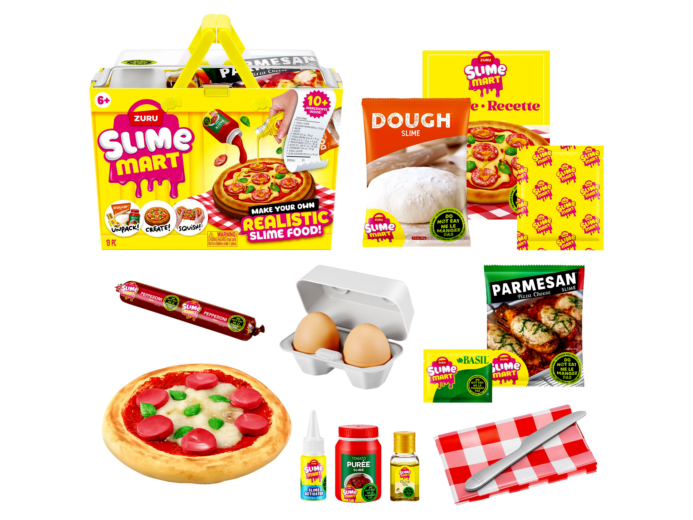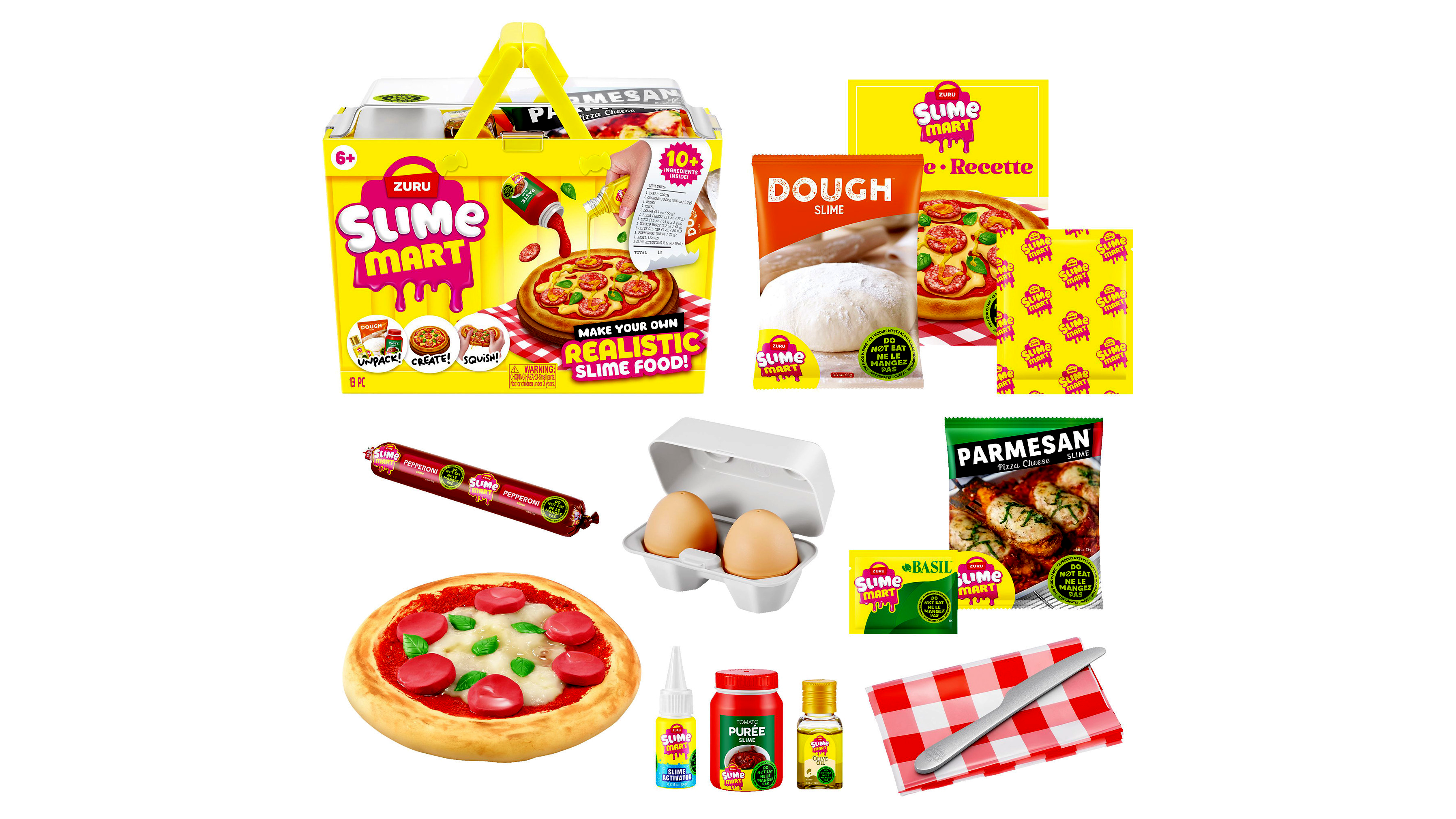 A szettben található nyálkás összetevők puha, gyúrható és nyomkodható állagúak, így rendkívül jó érzés kézben tartani őket. A tematikus kiegészítők segítségével a gyerekek valósághű „ételeket” – például pizzát vagy hamburgert – formázhatnak, miközben játékosan fejlődik: