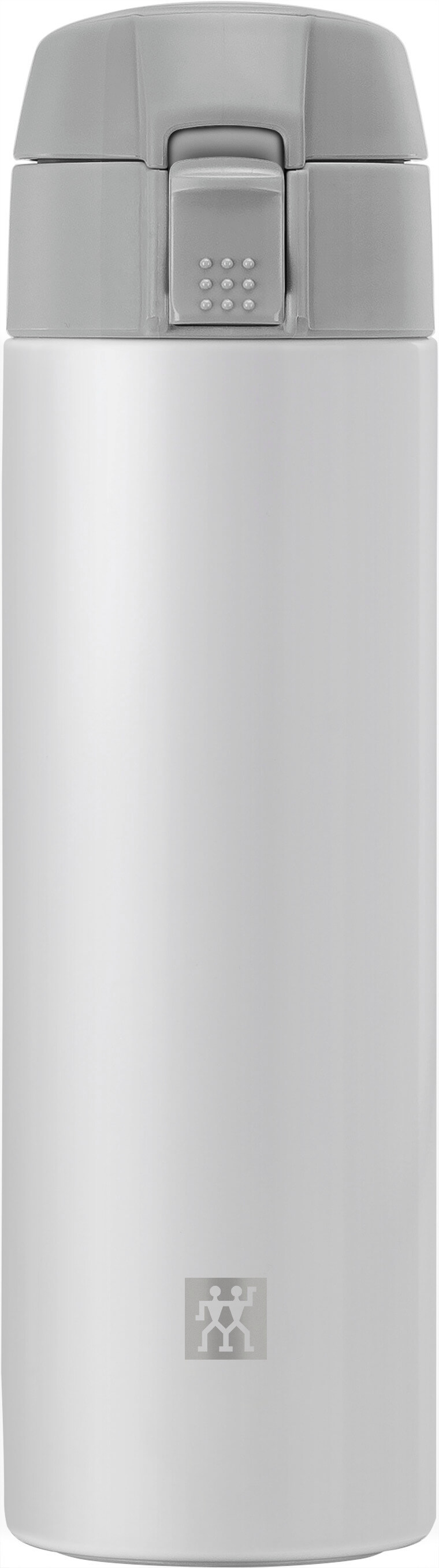 A Thermo Travel Bottle ideális kávé, tea vagy hideg italok munkába, autókirándulásokra vagy sporteseményekre való magához. A forró italok akár 7 órán át melegek, míg a hideg italok akár 12 órán át hidegek maradnak. Az egy érintéssel nyitható fedél egykezes működtetésre készült, biztonsági zárral, amely megakadályozza a véletlen nyitást. A csúszásgátló fenék pedig megakadályozza a kiömlést töltés közben. A levehető fedél megkönnyíti a takarítást, különösen, ha mosogatógépbe dobja. Ez az ezüst-fehér és fekete matt színben kapható vonzó palack stílusos módja annak, hogy útközben vigye magával az italokat.